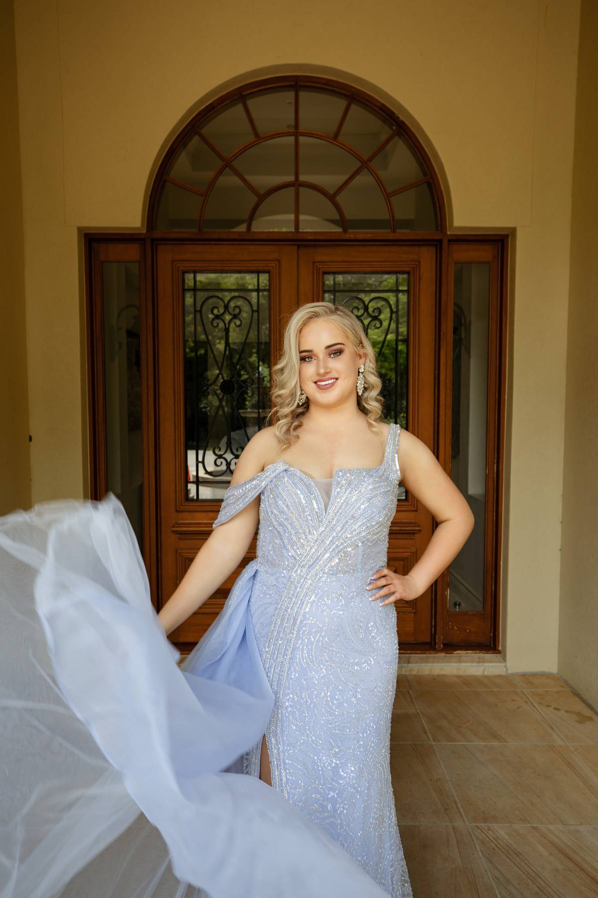 Radiating red-carpet allure, the Mia Gown is a vision of sophistication and charm. This icy blue masterpiece dazzles with intricate beadwork reminiscent of twinkling constellations. The gown features a unique off-the-shoulder strap detail, a structured sweetheart neckline, and a thigh-high slit that adds a bold touch. Flowing behind, a delicate tulle overskirt creates an ethereal silhouette, ensuring an unforgettable entrance. Perfect for those who seek to captivate and shine, this gown is your ultimate statement piece.
