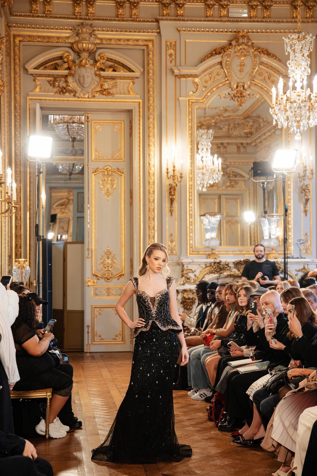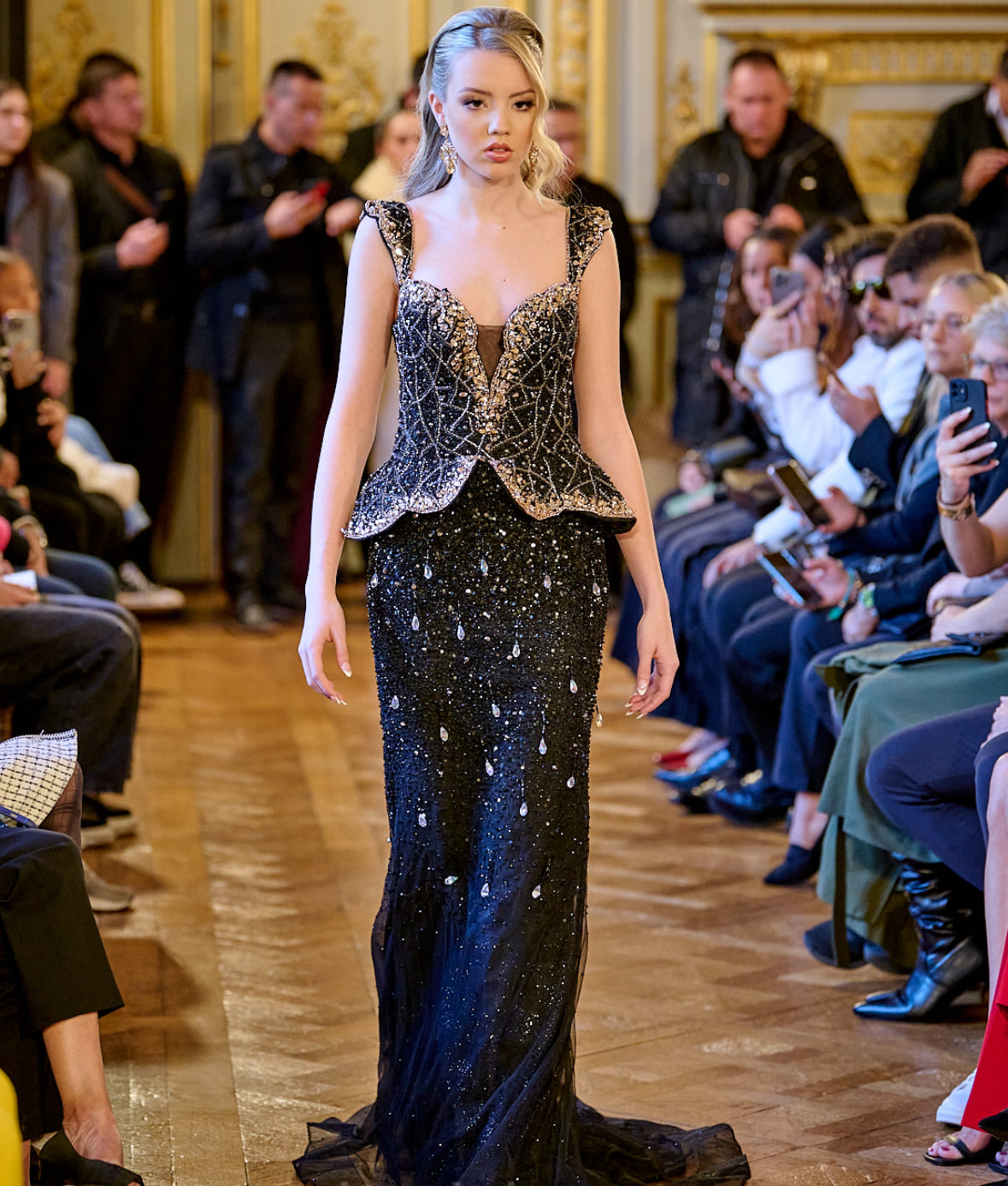 The Ivy Gown captivates with its slimline black silhouette, accented by radiant gold trim and exquisite beadwork. An off-the-shoulder sweetheart neckline enhances the drama, striking the perfect balance of elegance and mystery.