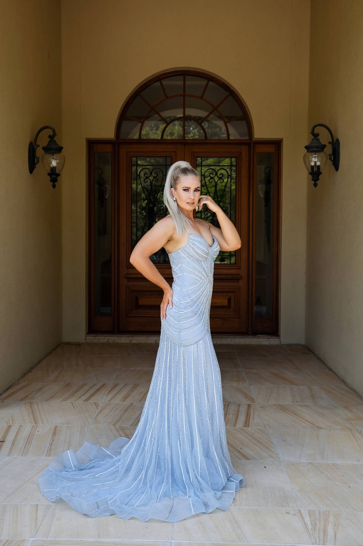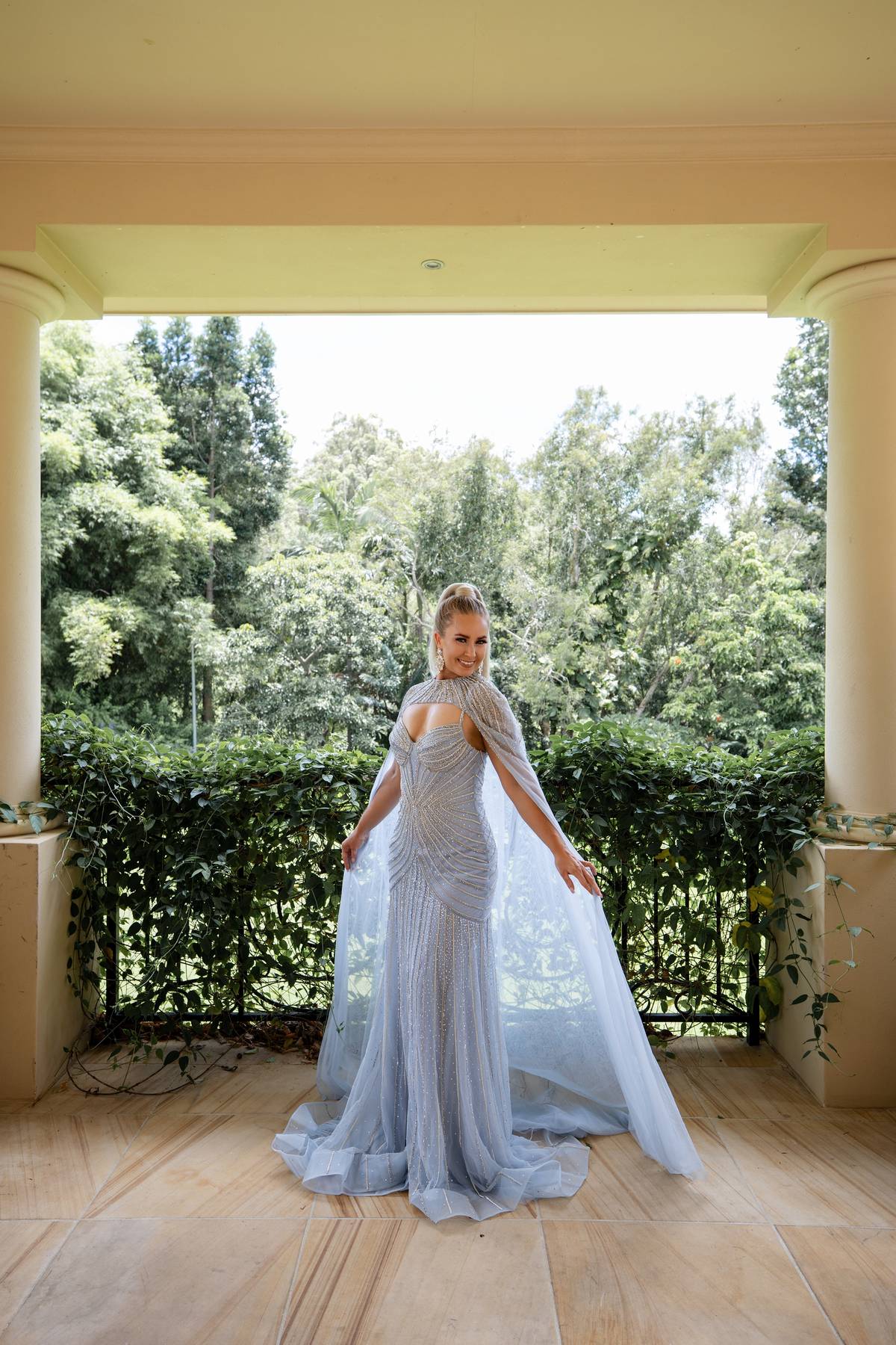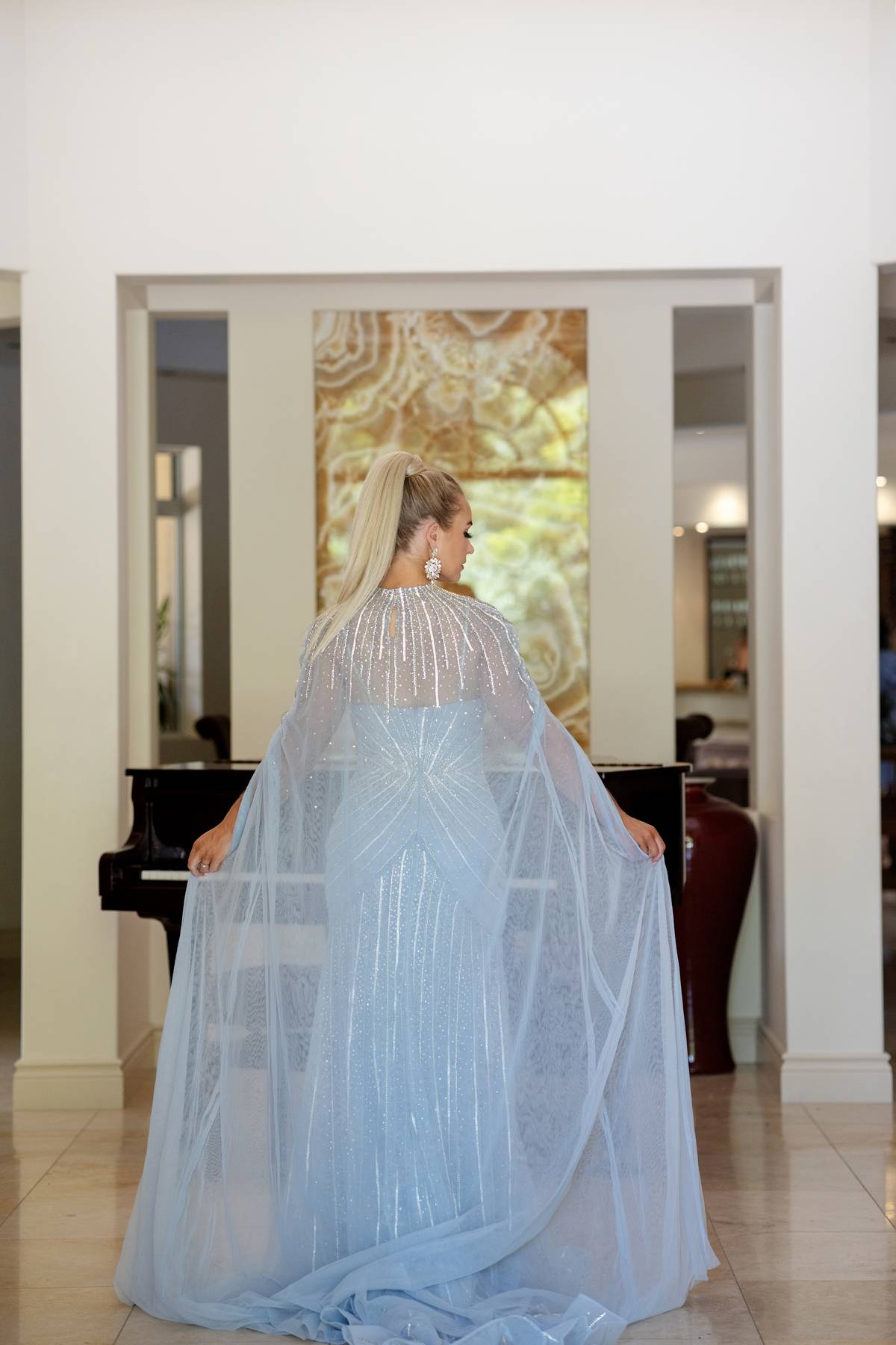 The Leah Gown embodies celestial elegance with its shimmering silver tones and intricate beadwork. Featuring a structured, sculptural bodice with a modern cutout detail, the gown accentuates the silhouette with geometric embellishments that cascade gracefully into the skirt. Adding a regal touch, the ethereal cape is crafted from sheer tulle and adorned with subtle sparkle, creating a dramatic, flowing effect. Perfect for red-carpet events or glamorous galas, the Leah Gown ensures a breathtaking entrance.
