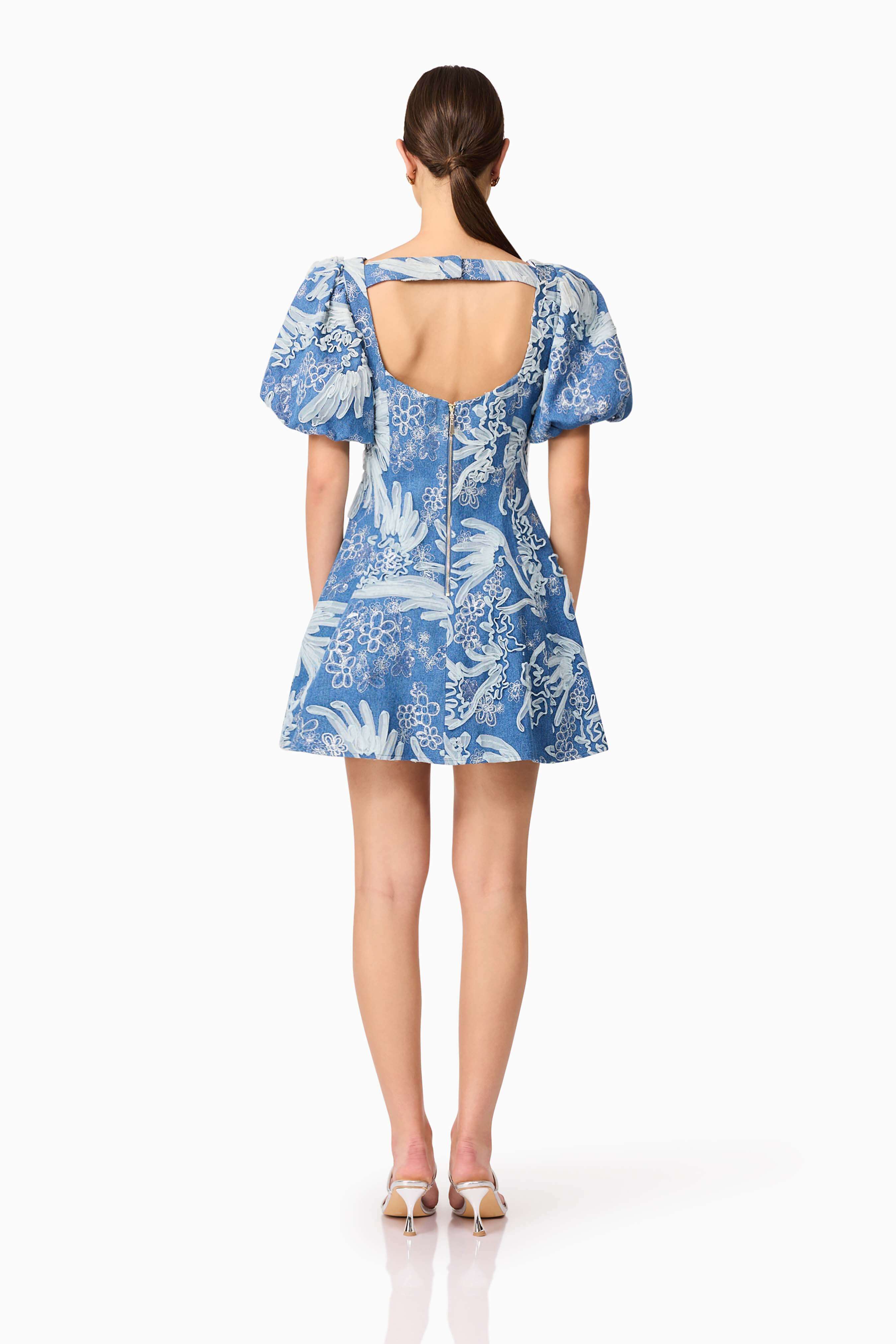 Crafted from embroidered denim fabrication, the Anneliese offers both structure and texture without feeling heavy. The boat-shaped neckline balances the voluminous puff sleeves, creating a clean, flattering line across the shoulders. At the back, a bold open cut-out is anchored by a sleek strap and snap button closure, giving the dress an unexpected yet wearable detail.