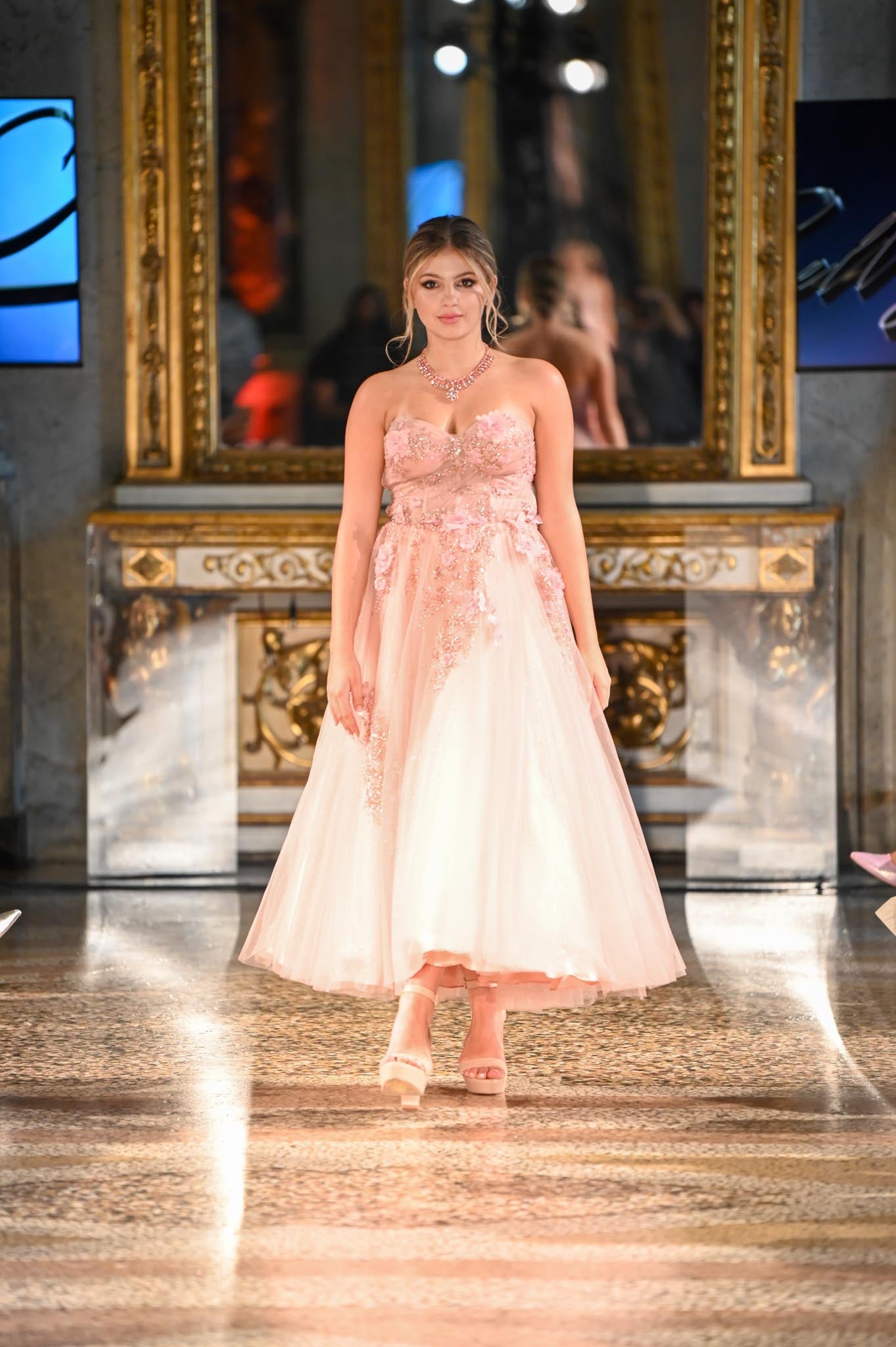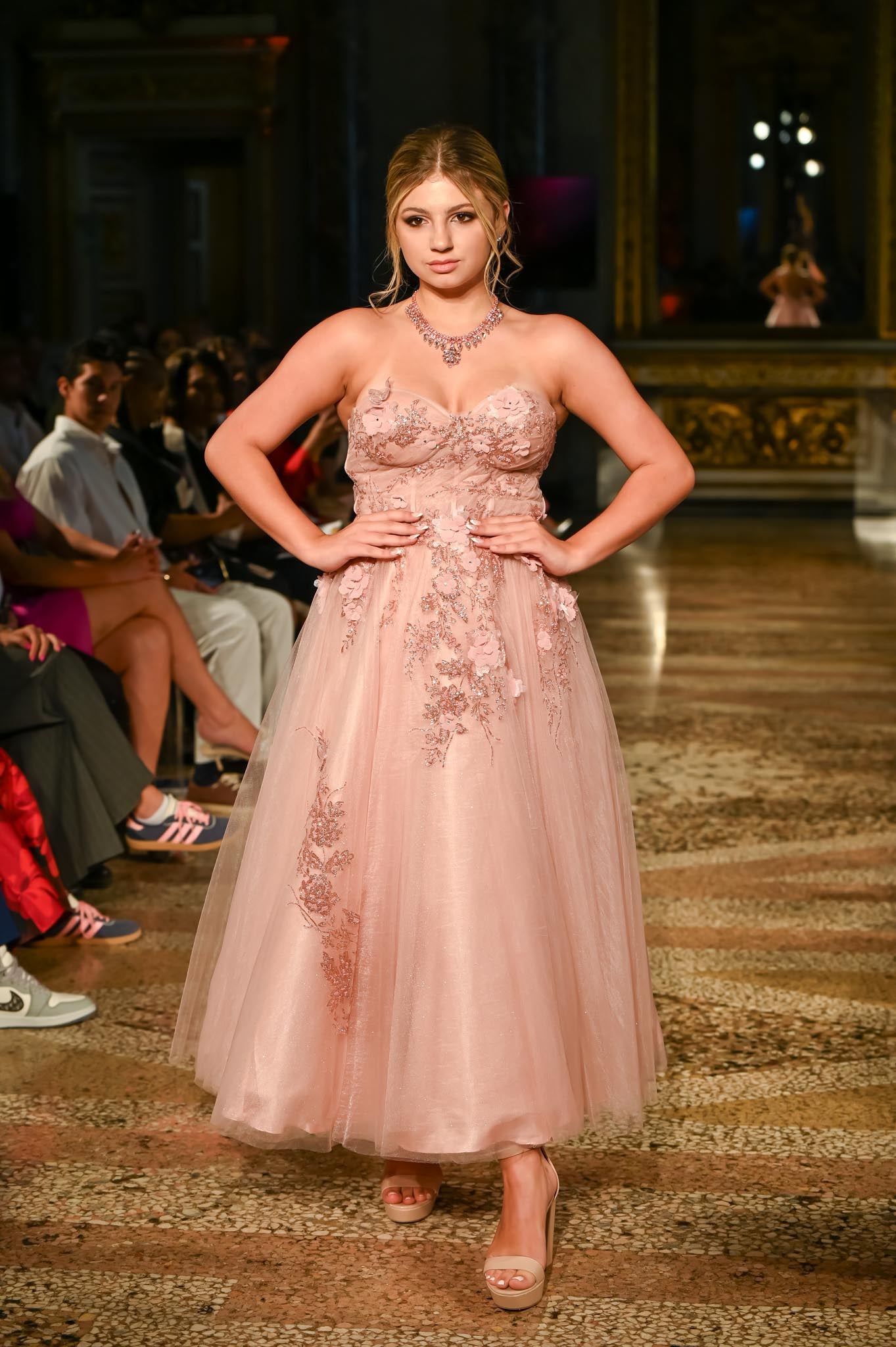 This strapless a-line cocktail dress is the perfect mix of girly and glam for your next event. This stunning piece features a ruched bodice and layered tulle skirt, adding texture and depth to the overall look. The floral applique and glitter embellishment adds a touch of sparkle and playfulness to the dress, making it perfect for any feminine woman. The a-line design allows for a flattering silhouette and ease of movement. Made from a comfortable and easy to wear fabric, the tea length cut is perfect for twirling and dancing the night away.
