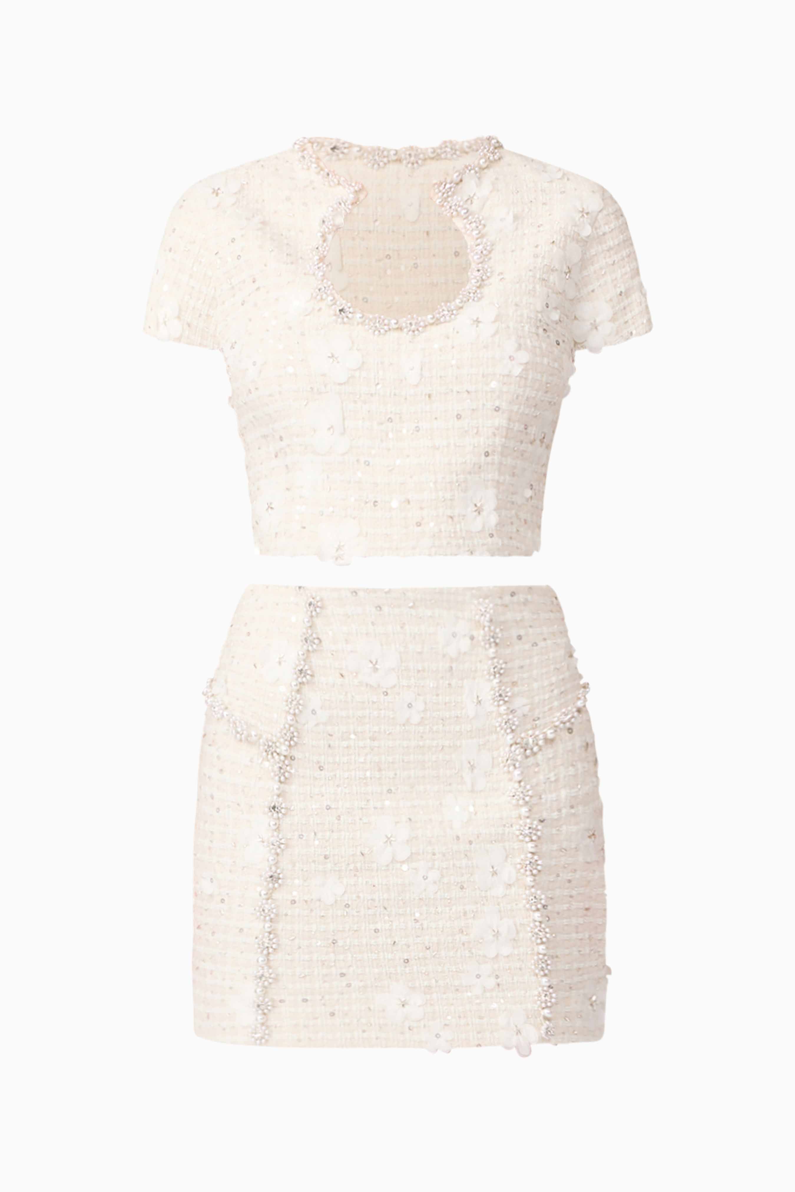 Chic and feminine, the Ellouise Embellished Tweed Set in White is a modern take on classic elegance. Featuring a structured top and matching mini skirt, this coordinated look is crafted from textured beaded tweed fabrication and finished with refined pearl accents for a timeless appeal.