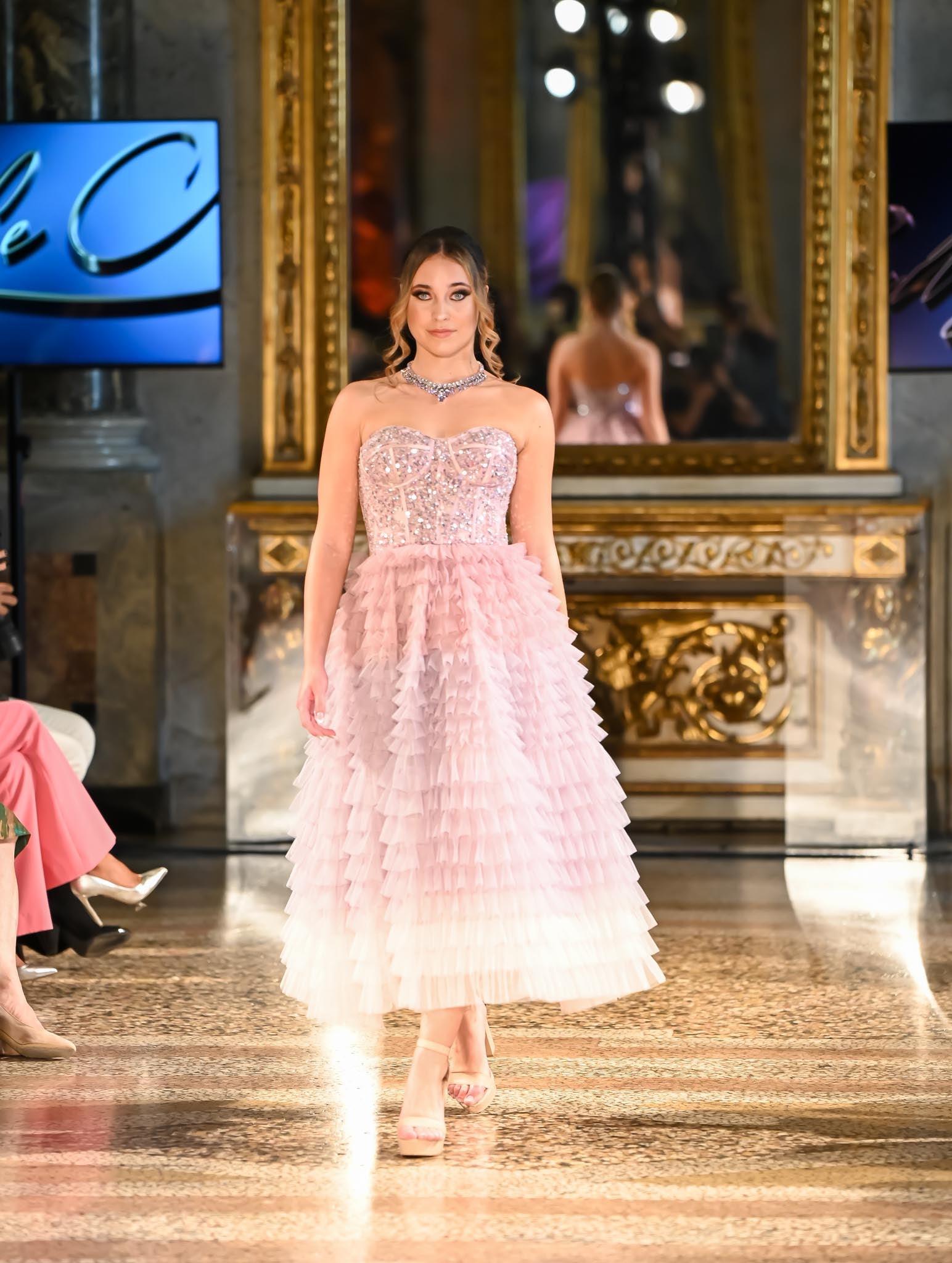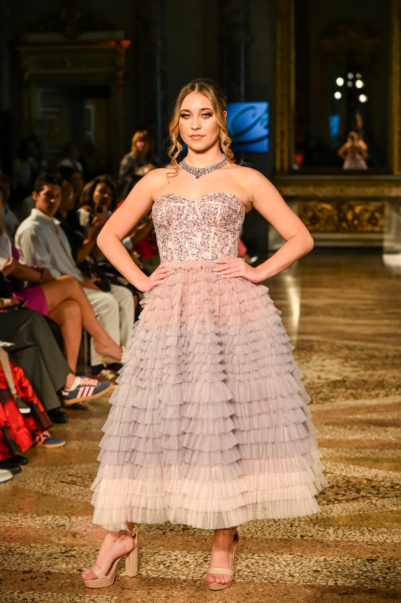 Step into a fairy-tale with our strapless tea length gown—a whimsical wonder designed for enchanting moments. The beaded structured bodice is a glistening embrace, catching the light like dewdrops in a meadow. Below, the ombre ruffled tulle skirt creates a magical cascade, a dance of colors that swirl with each step. The laced-up back adds a touch of romance, ensuring a perfect fit and a hint of allure. It's not just a gown; it's an invitation to twirl through dreams and dance in the hues of love. Let the dress be your canvas, where each bead and ruffle tells a tale of timeless whimsy.