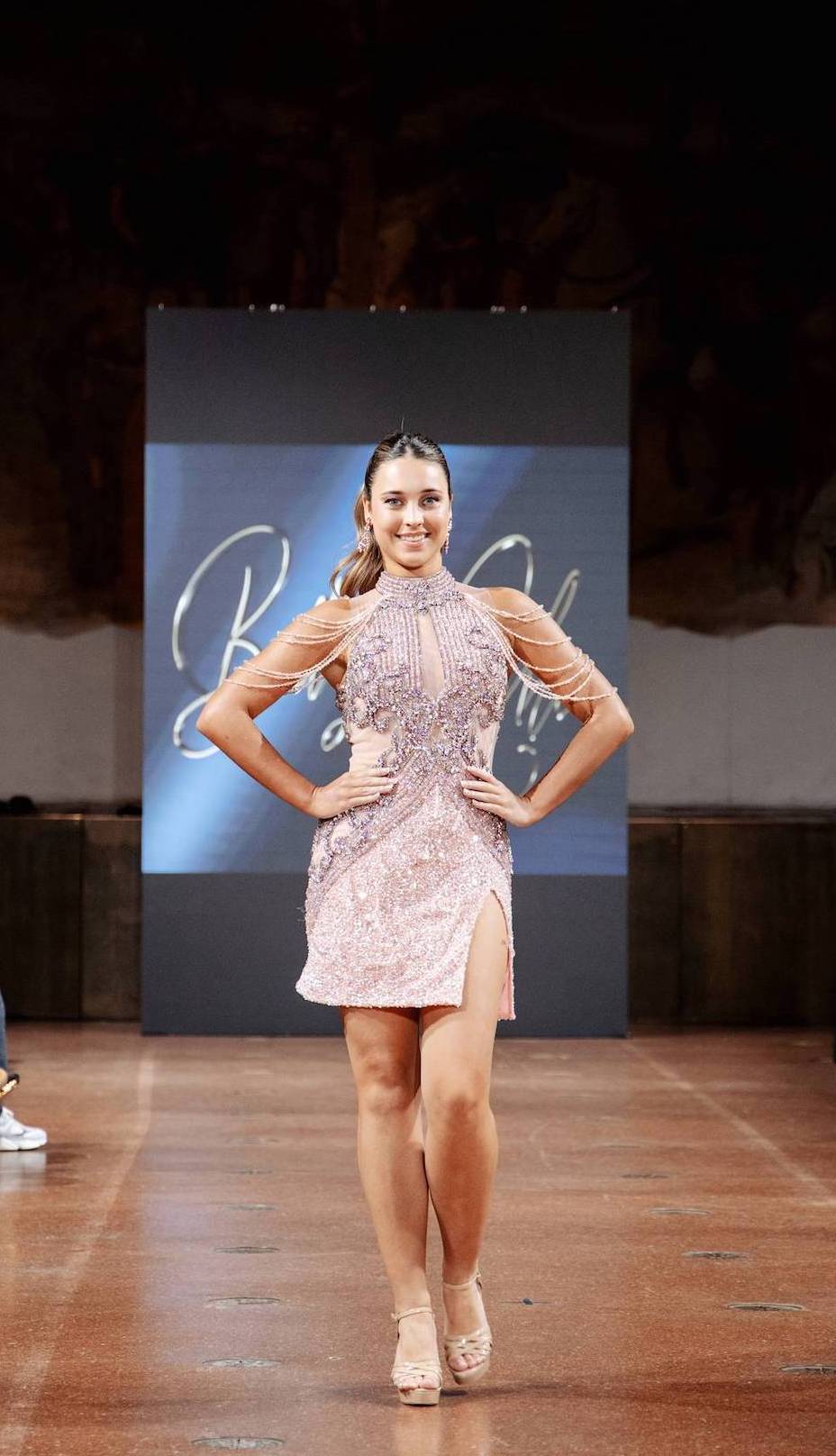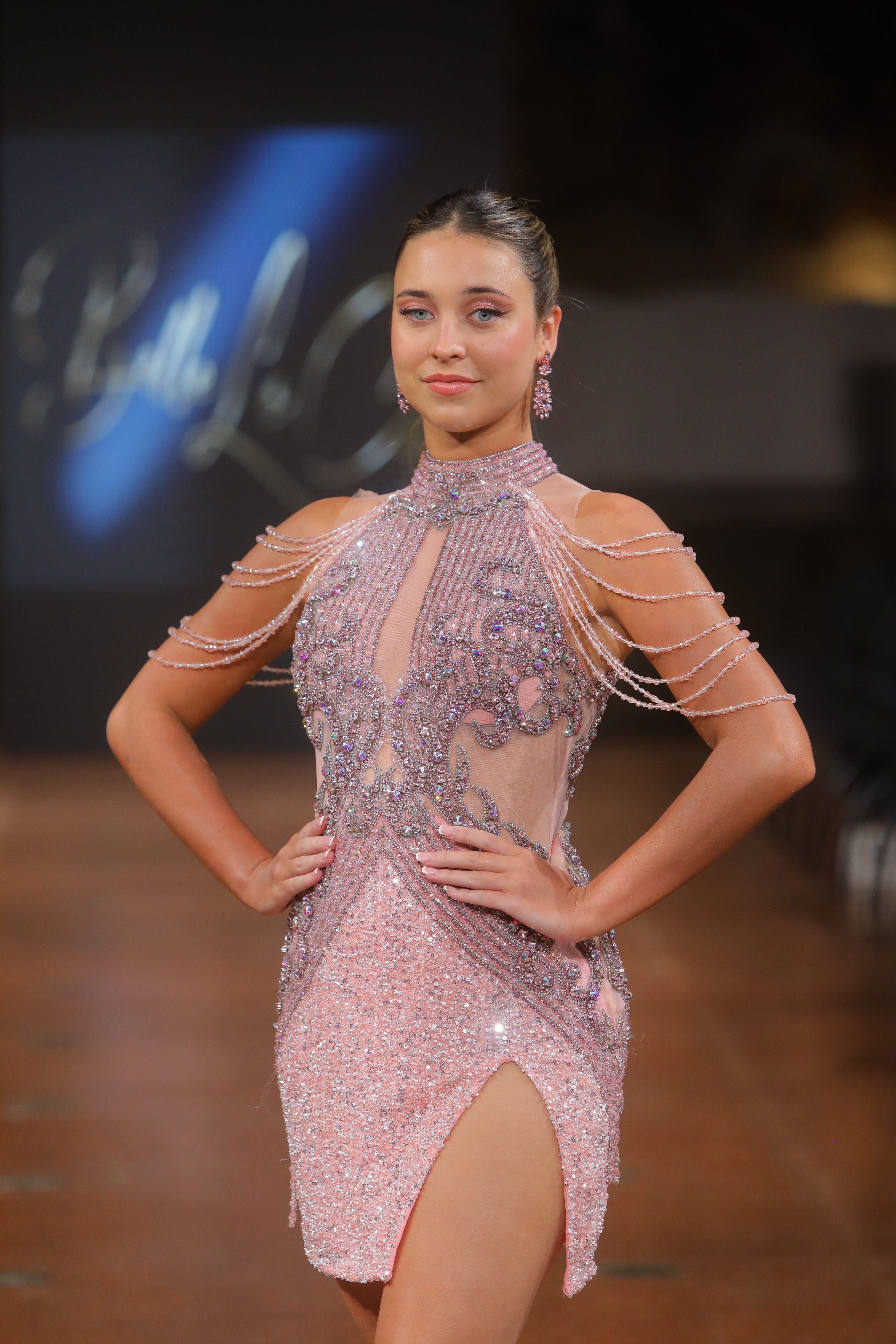The stunning PS24857C is a high neck mini dress by Portia and Scarlett featuring off-the-shoulder crystal straps and cut outs at the chest and waist. The dress has a high split on one side.
