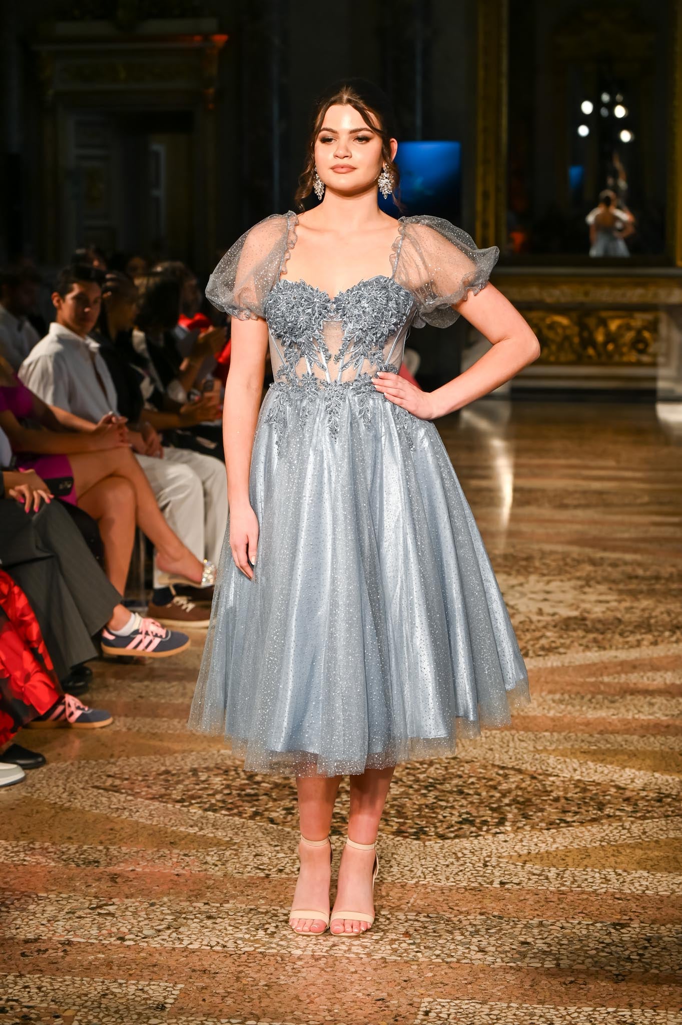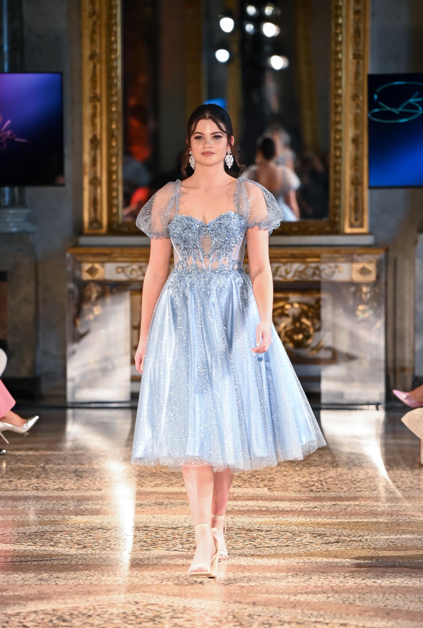 Are you a modern princess looking for the perfect outfit? Look no further than this dreamy tea-length layered tulle dress! Crafted with an airy, voluminous skirt of sparkling glitter tulle in a classic A-line silhouette, this showstopper is sure to make your night one to remember. The sweet puff sleeves provide delicate allure while the lace embellished bodice adds cinematic drama. Finally, a sheer boned bodice adds structure and elegance to complete this exquisite princess look. Wear it for elegant soires, starlit gala nights or afternoon tea in style – you'll be the belle of the ball in this truly enchanting ensemble!