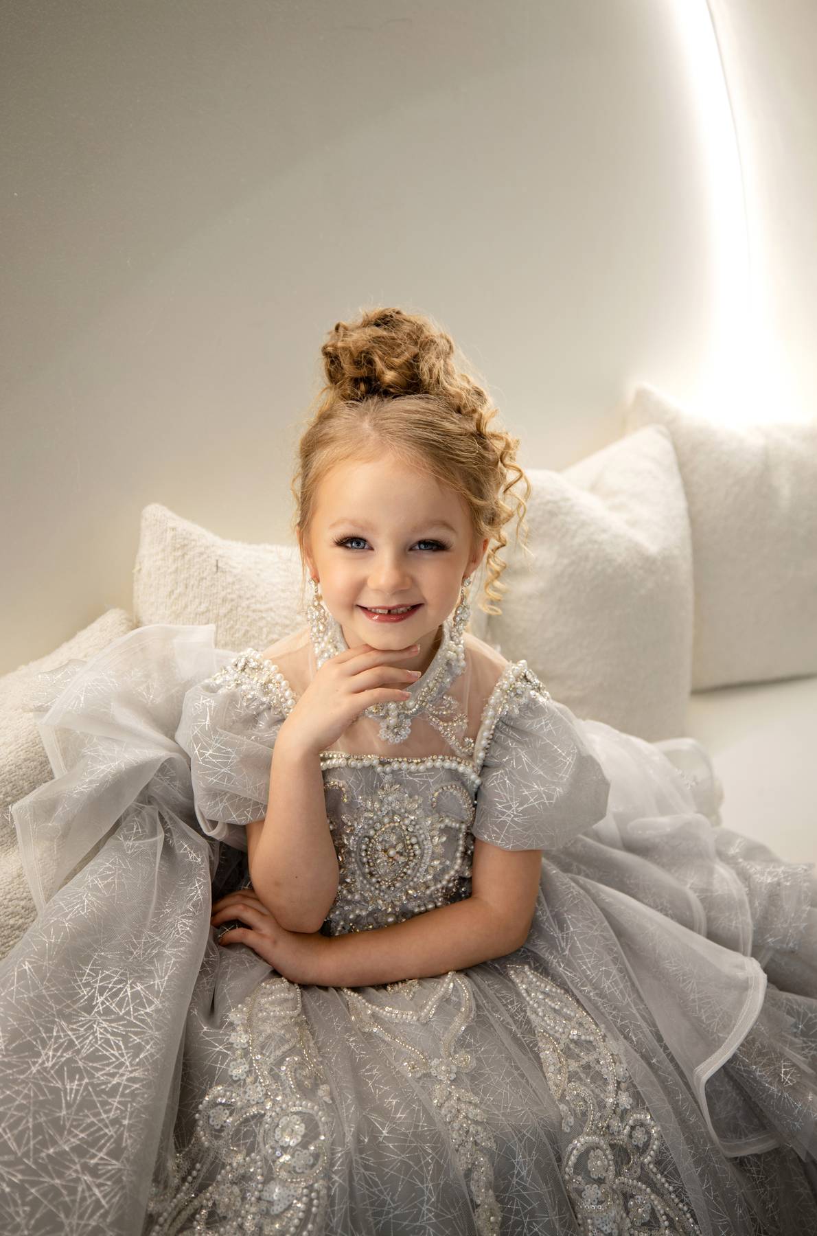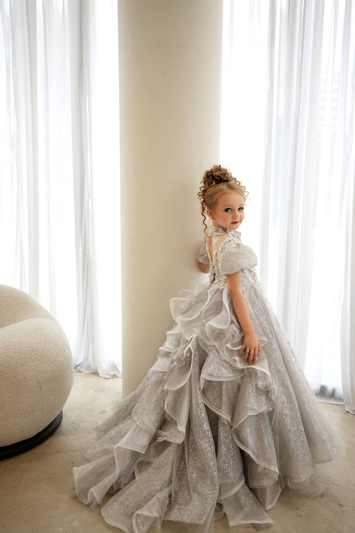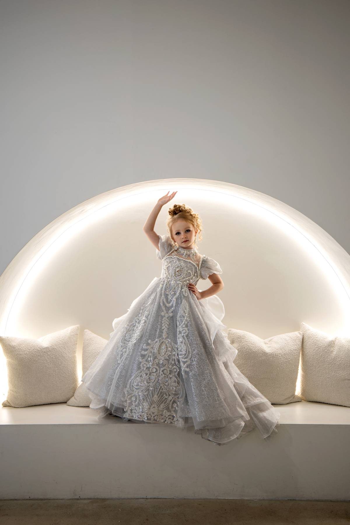 The Arabella Gown is a breathtaking vision of elegance and grace, designed for young fashionistas who love to shine. This silver ballgown features delicate puffy sleeves, adding a touch of regal charm to its silhouette. The shimmering fabric catches the light beautifully, making it perfect for special occasions where every detail matters. With a full, flowing skirt that creates a fairytale-like presence, the Arabella Gown is a true showstopper, blending timeless sophistication with a modern princess feel