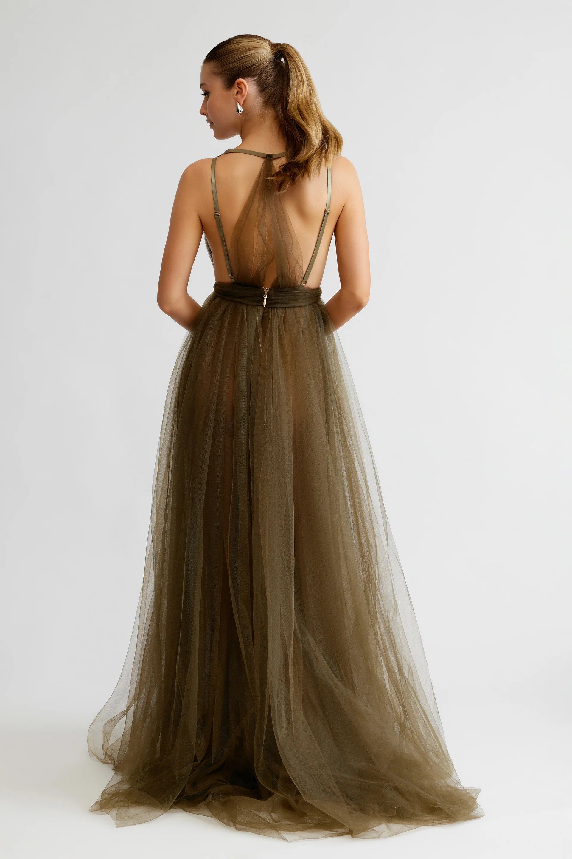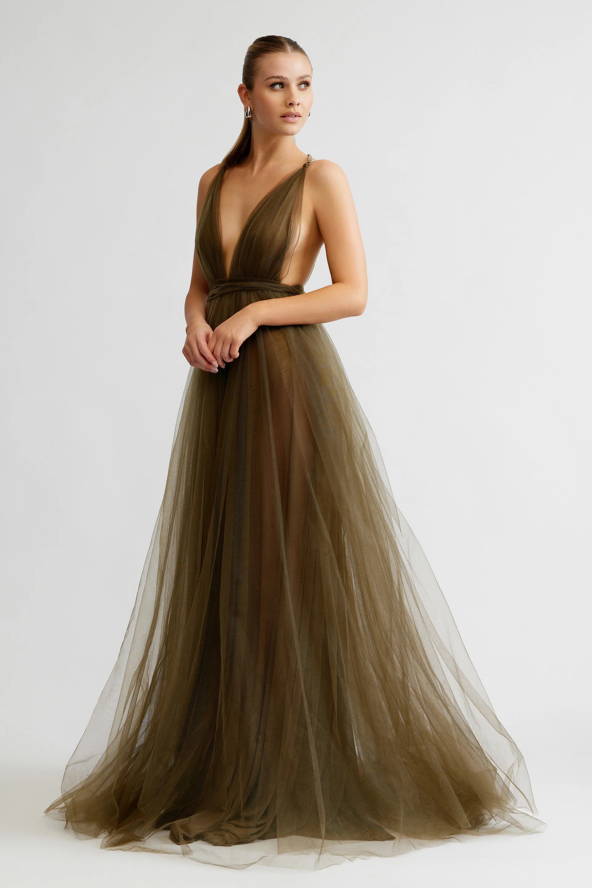 - Layered tulle gown with deep V neckline