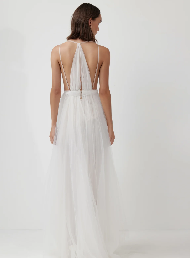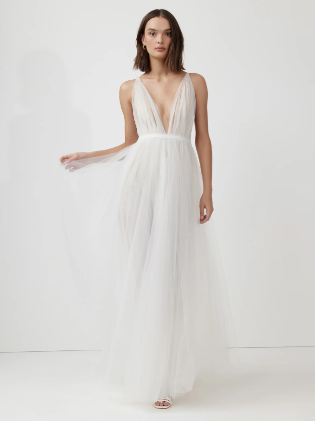 The Cynthia Dress is crafted from a soft, romantic tulle that is gathered into a full, flowing skirt. It features a deep V neckline with soft layers of tulle, straps are adjustable.