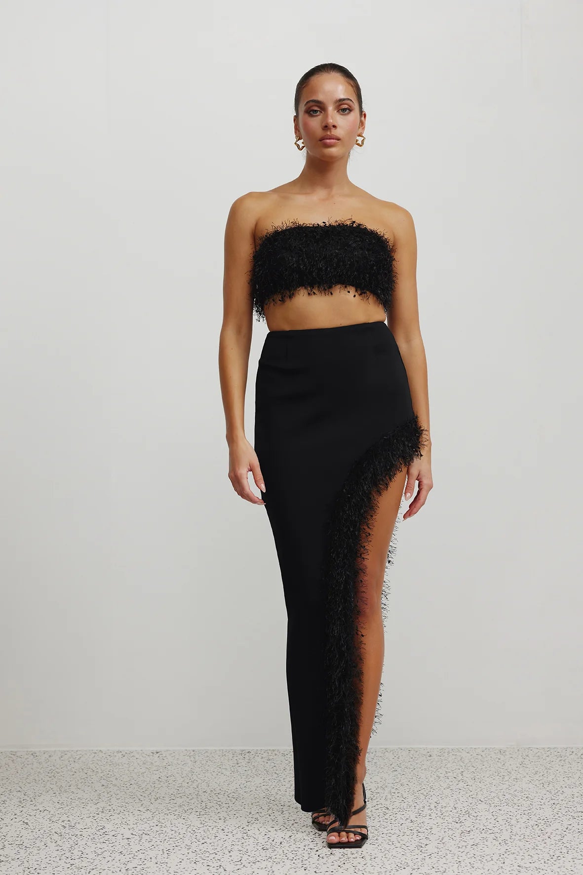 - Showcasing fluffy feathered look fabrication