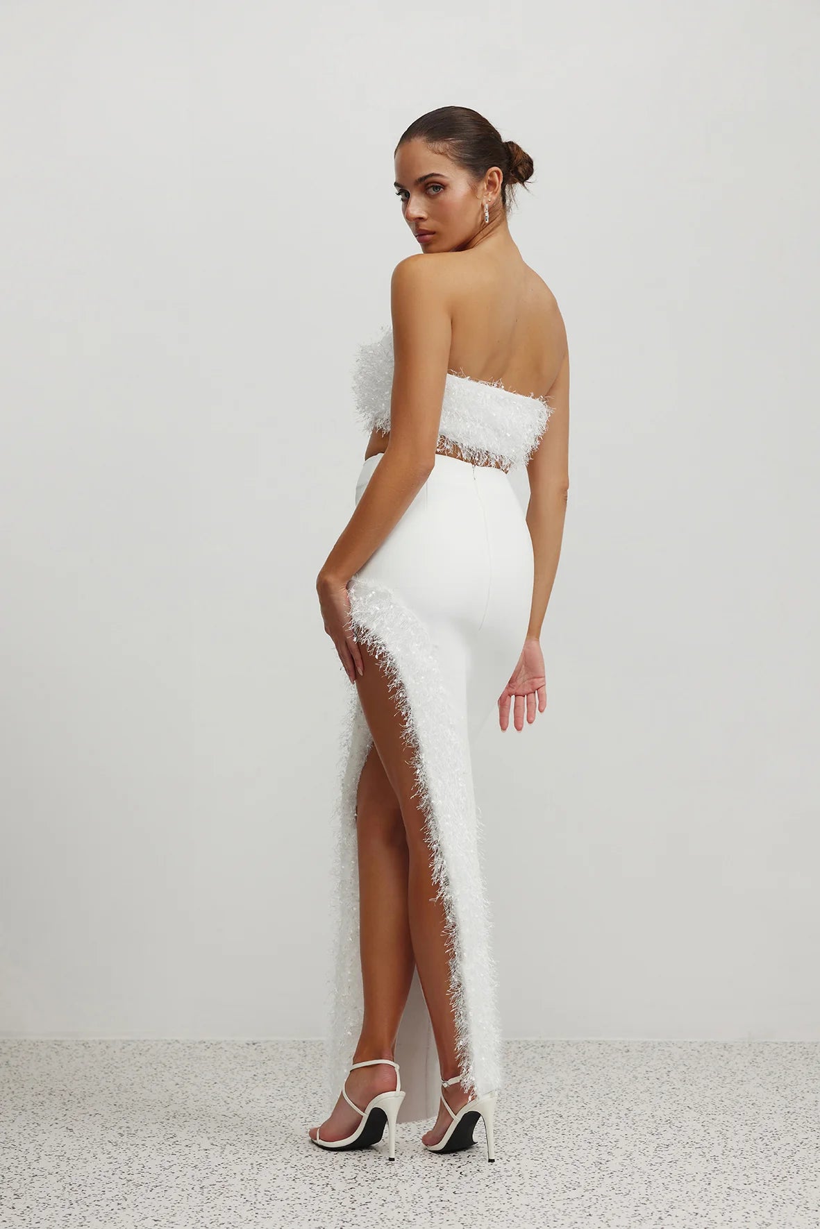 The Margarita Set showcases a unique fluffy feathered look throughout the bodice and trim of the skirt. The set is made from a stretchy scuba fabrication, which flatters the body and provides ultimate comfort. The skirt exposes the left leg, creating ultimate sexy and flirty look.