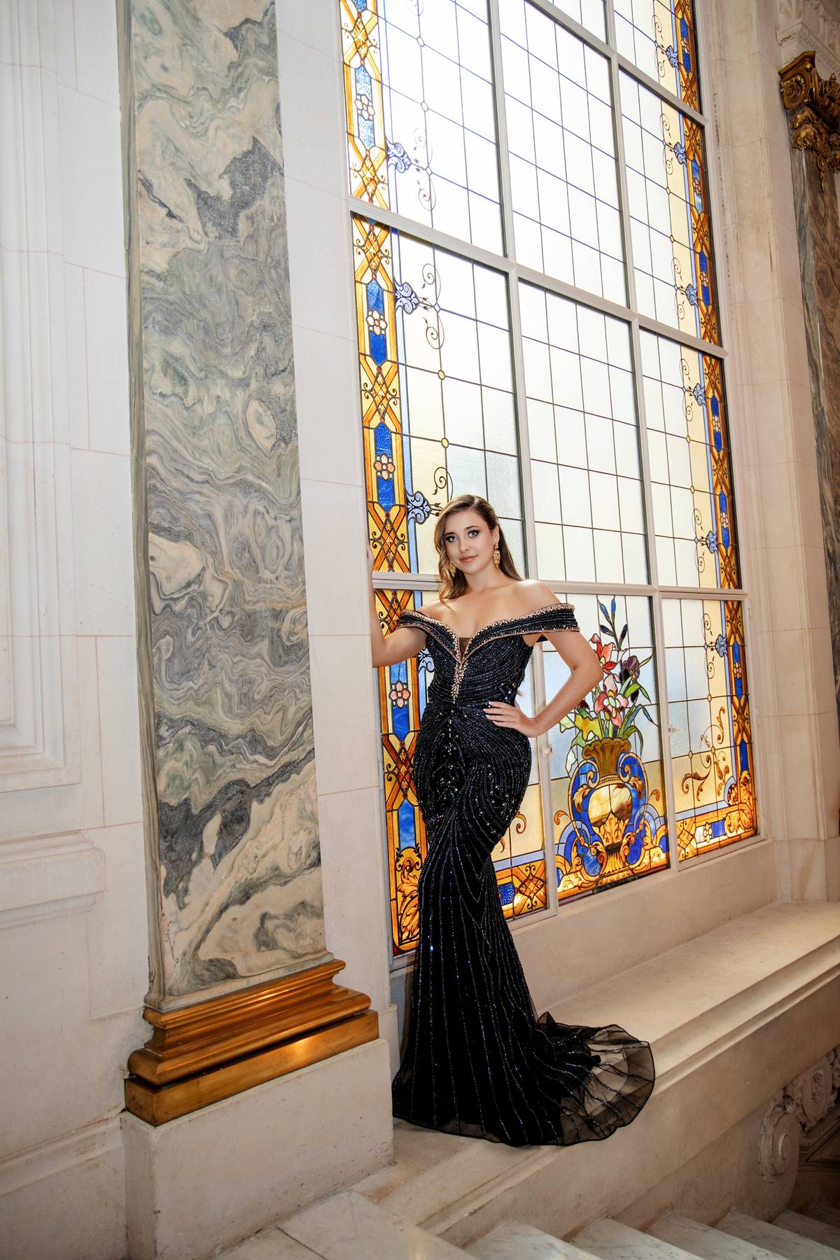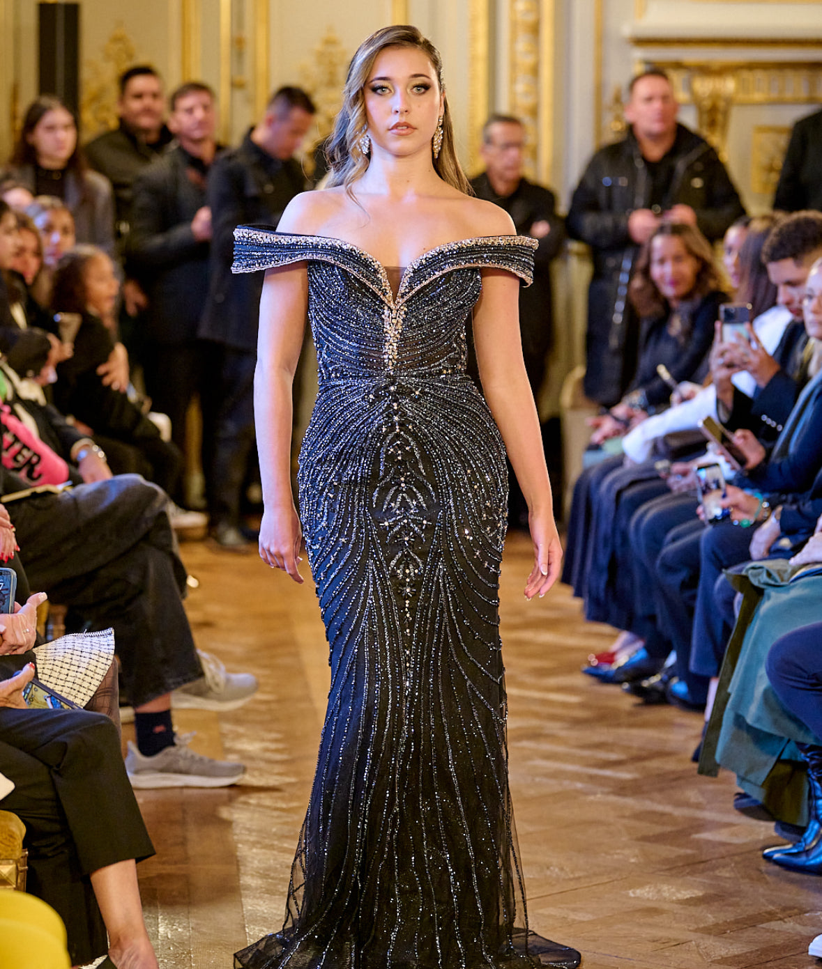 The Isabelle Gown embodies dark allure with a slimline fitted silhouette in sleek black, edged with glimmering gold trim. An off-the-shoulder sweetheart neckline adorned with intricate beadwork completes the look with dramatic sophistication.