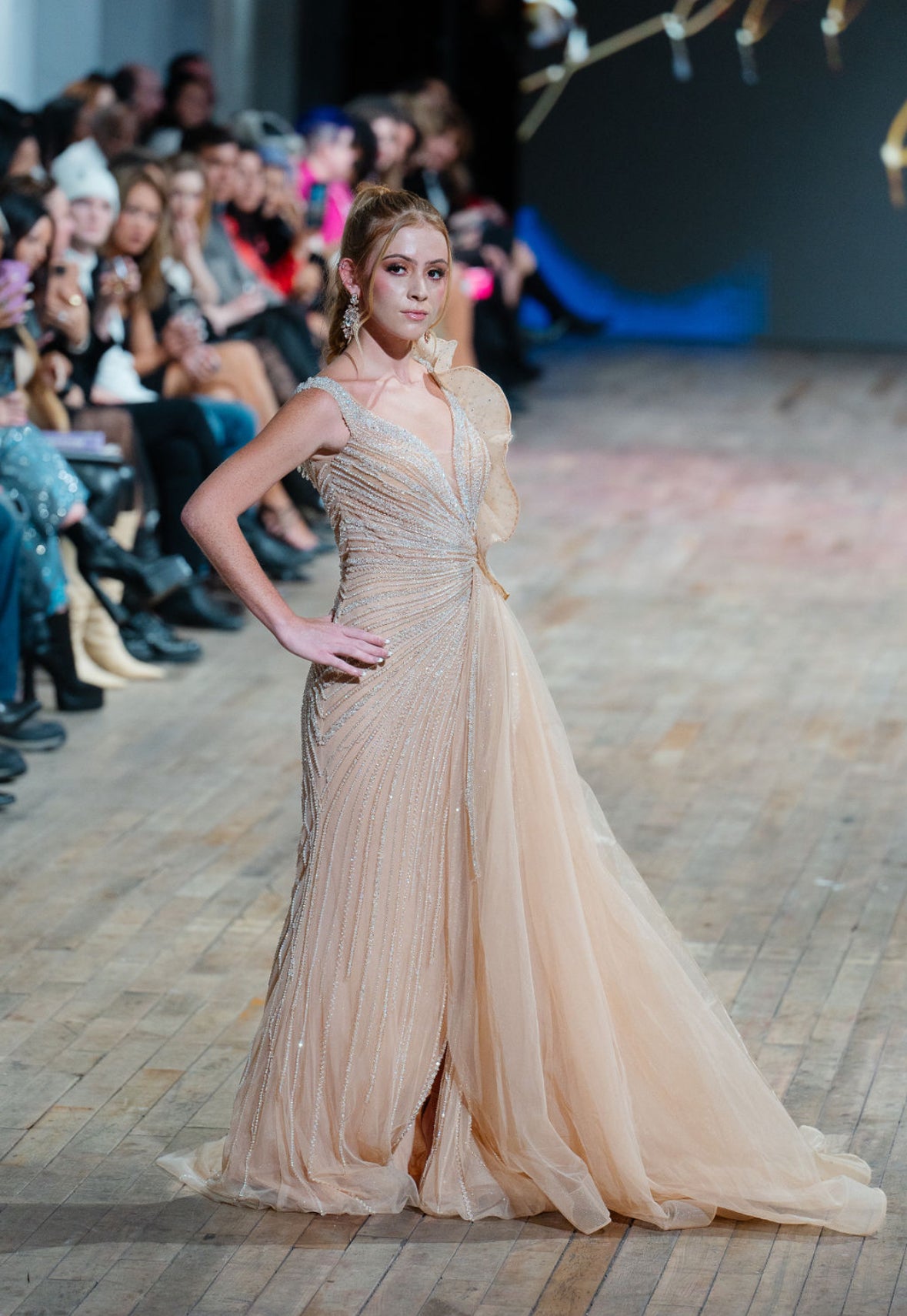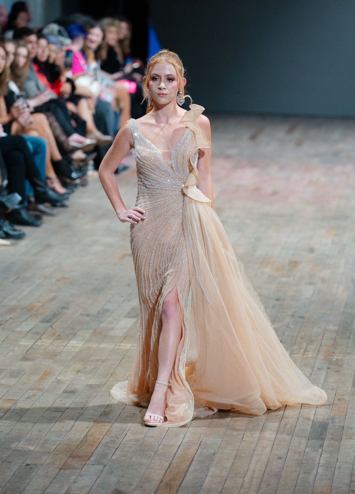 An enchanting addition to the Krystal Collection, the Stevie Gown exudes sophistication and charm. Designed with a high split and a flowing tulle side piece, this gown radiates movement and grace with every step. A delicate ruffle appliqué cascades across the design, adding texture and depth to its champagne canvas. Embellished with shimmering silver beading that glistens like crystalline reflections, the Stevie Gown embodies the collection's themes of purity, elegance, and strength, making it the perfect choice for those who seek a look that is both bold and ethereal.