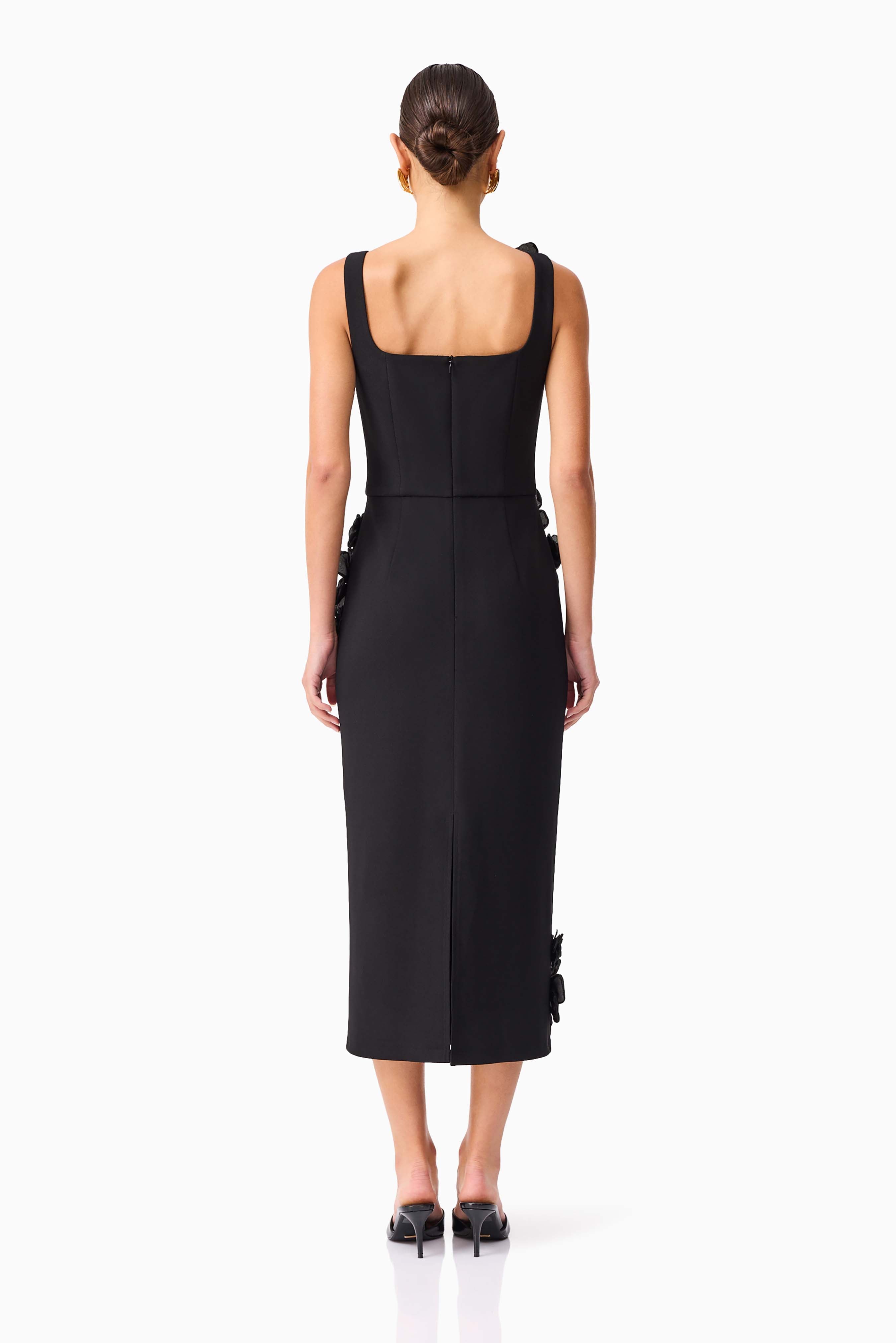 Made from a flexible fabric that hugs the figure, this midi dress is both flattering and wearable. The wide shoulder straps offer secure support, while the 3D floral embellishments add an artistic and tactile edge to the clean black base—bringing a subtle sense of drama to a classic cut.