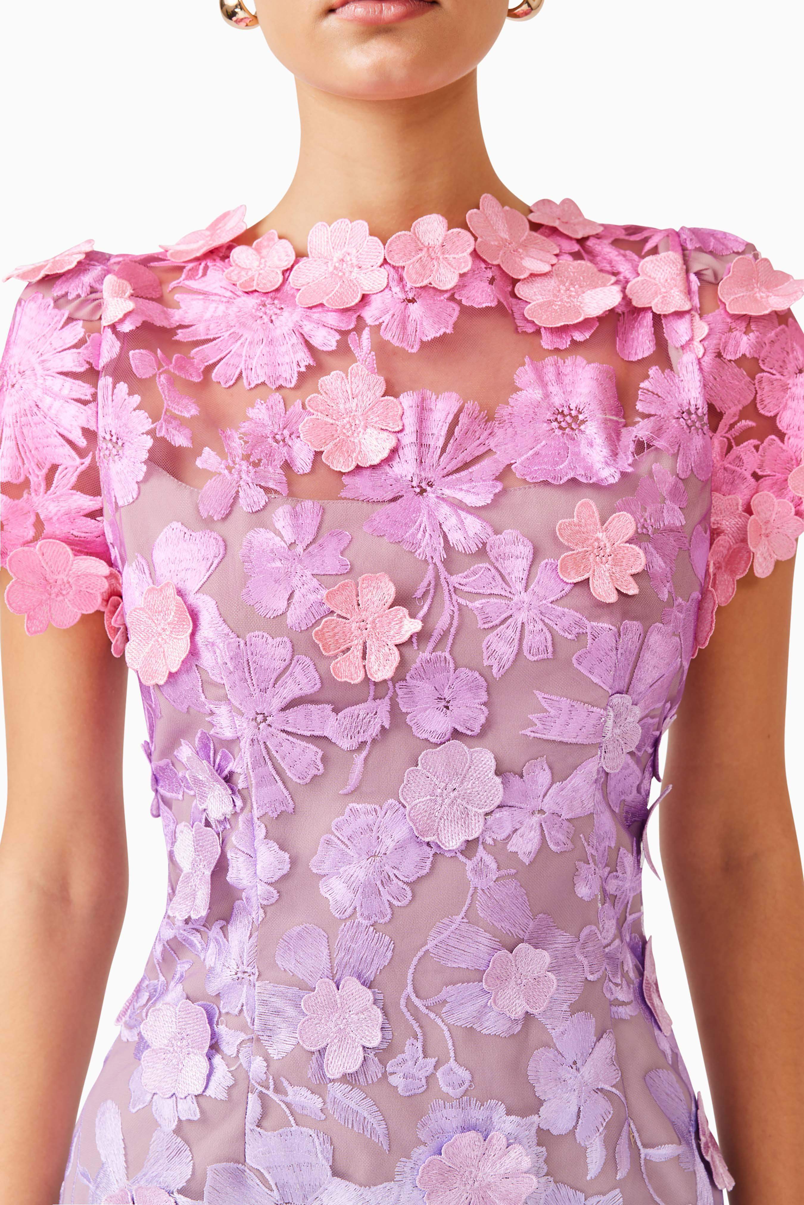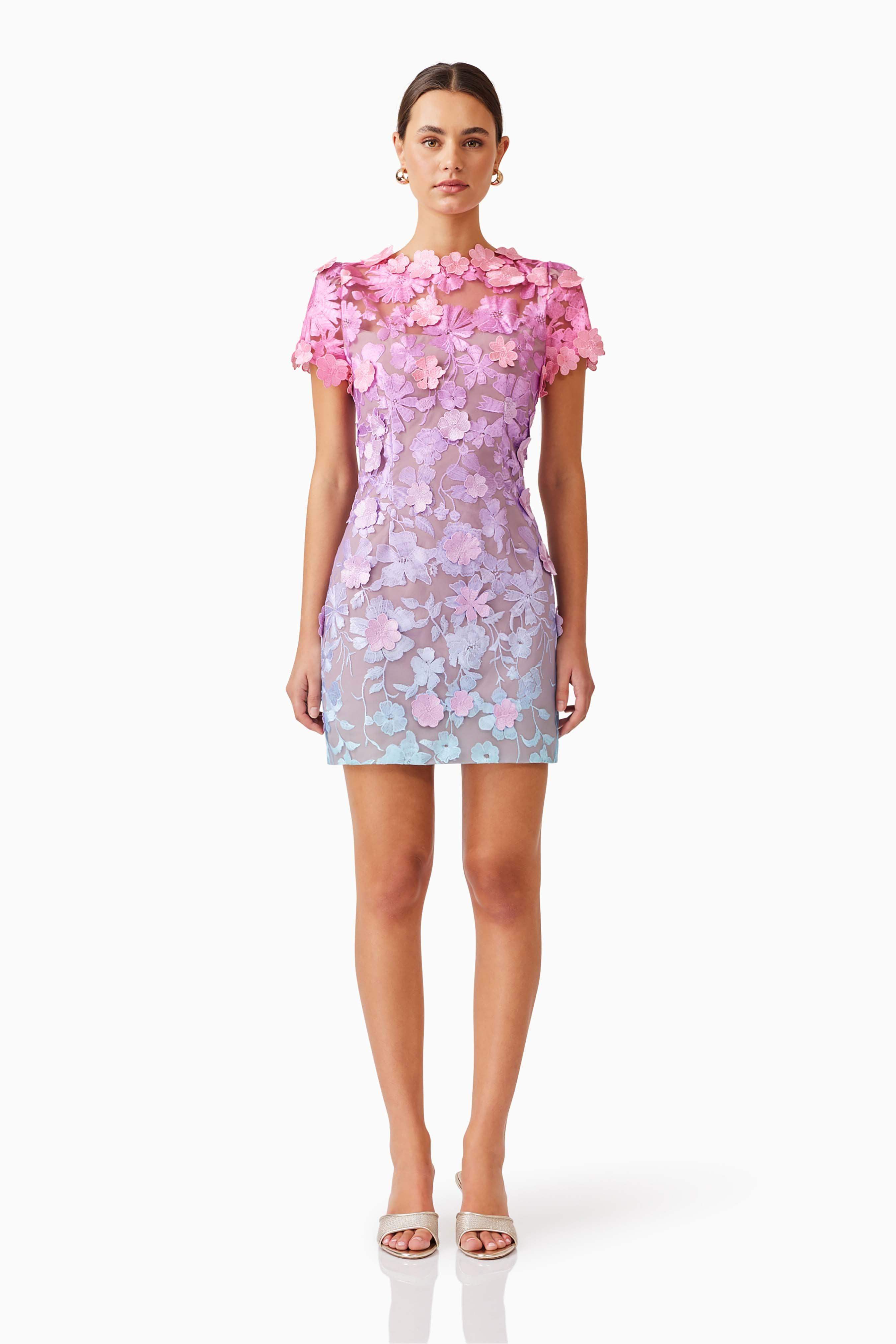 Step into elegance with the Elle Mini Dress, a dreamy fusion of soft pink, purple, and blue hues in an enchanting ombre design. This mini shift dress is crafted from exclusive 3D floral lace fabrication, creating a delicate yet striking aesthetic. The boat neckline enhances its refined silhouette, while the short sleeves, adorned with intricate floral trims, add a touch of romantic charm.