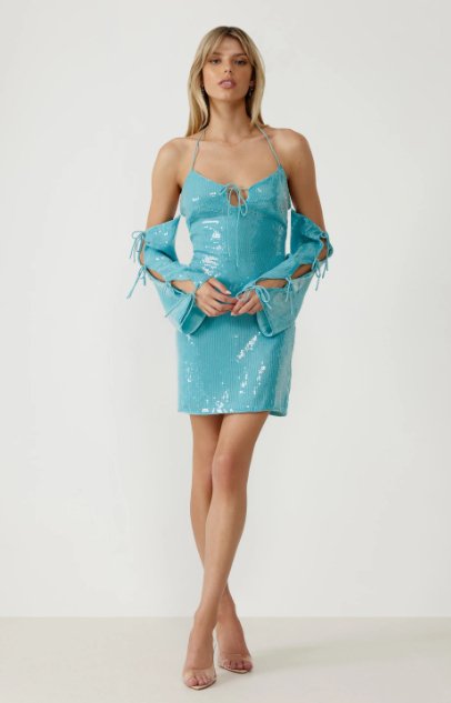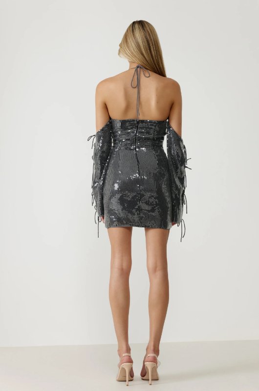 The Arlo Dress is the ultimate sexy party number to dance the night away! This flirty mini is crafted from our reflective sequin fabrication that catches the light with every move. This dress features tie up bows around the neck, at the front of the bodice and down the sleeves.