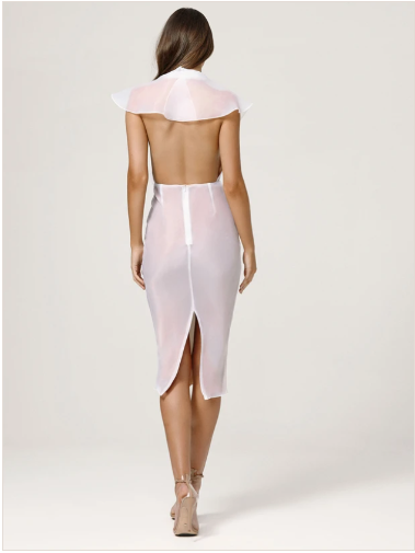 Soft and pretty ruffles cascade down the neckline of the Winnie dress which is cut from a sheer ivory organza with nude lining. It's all in the details right down to the fluted hemline and cut-out back which is fastened with a hook and eye closure at the nape of the neck.