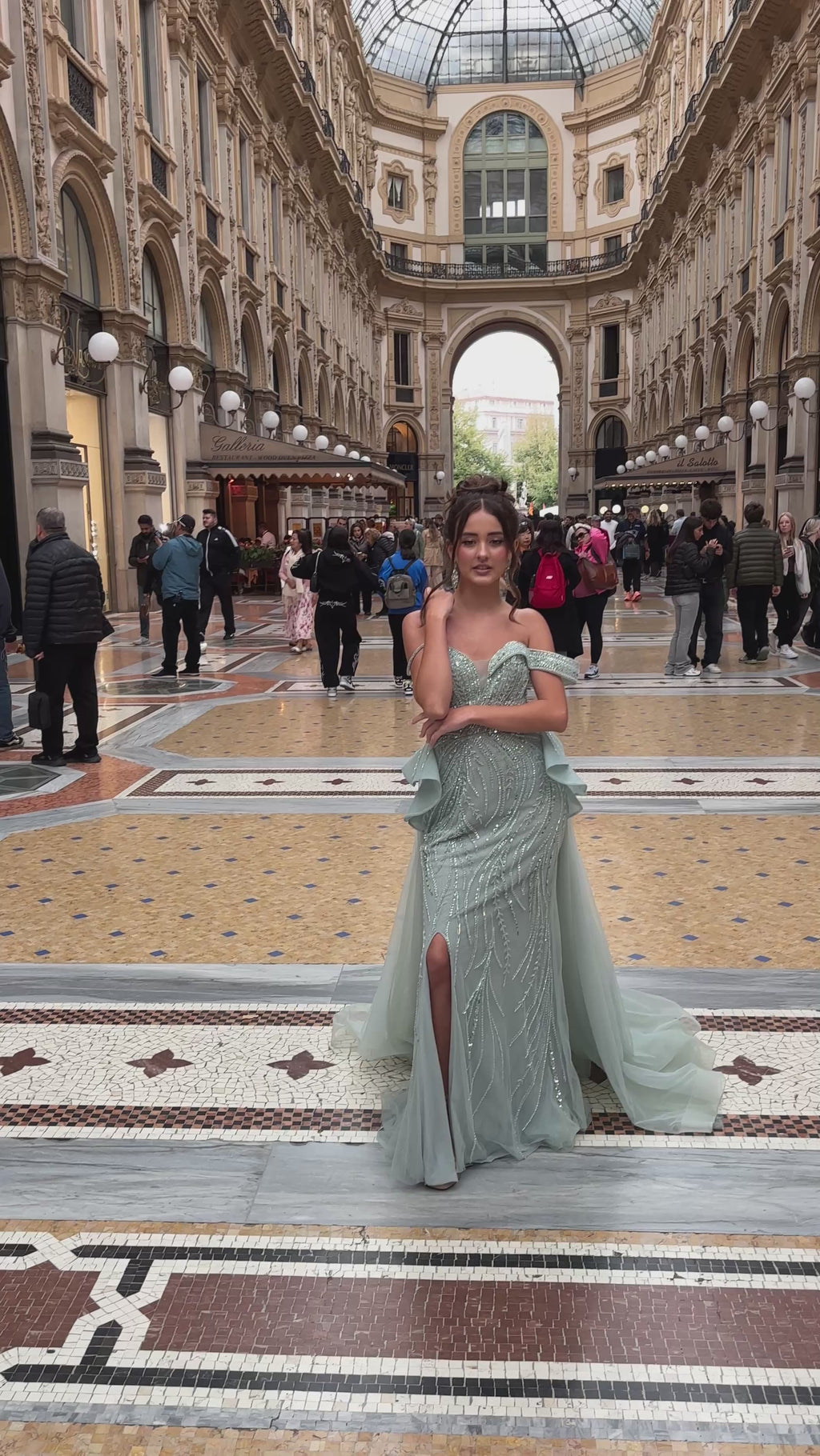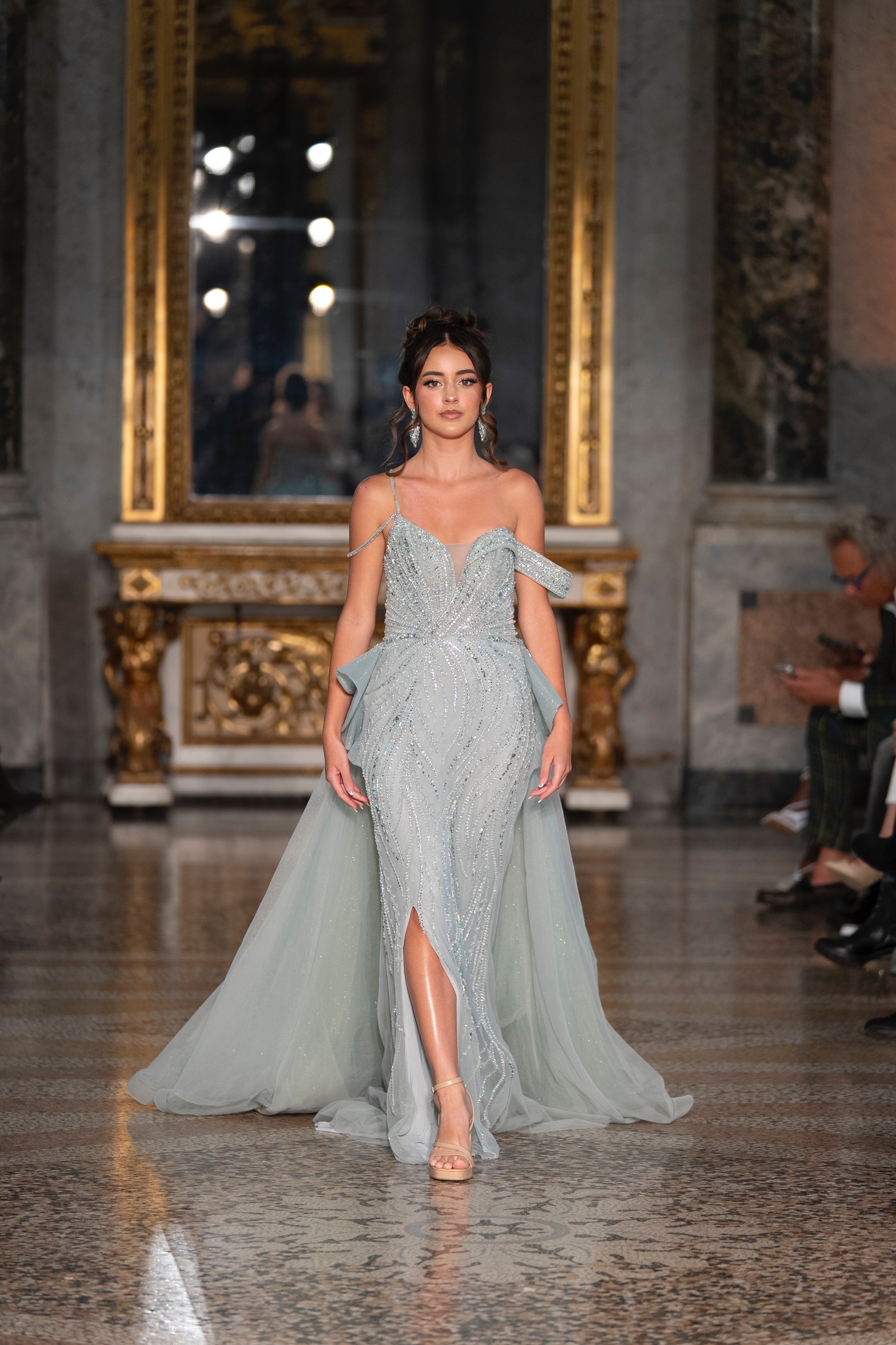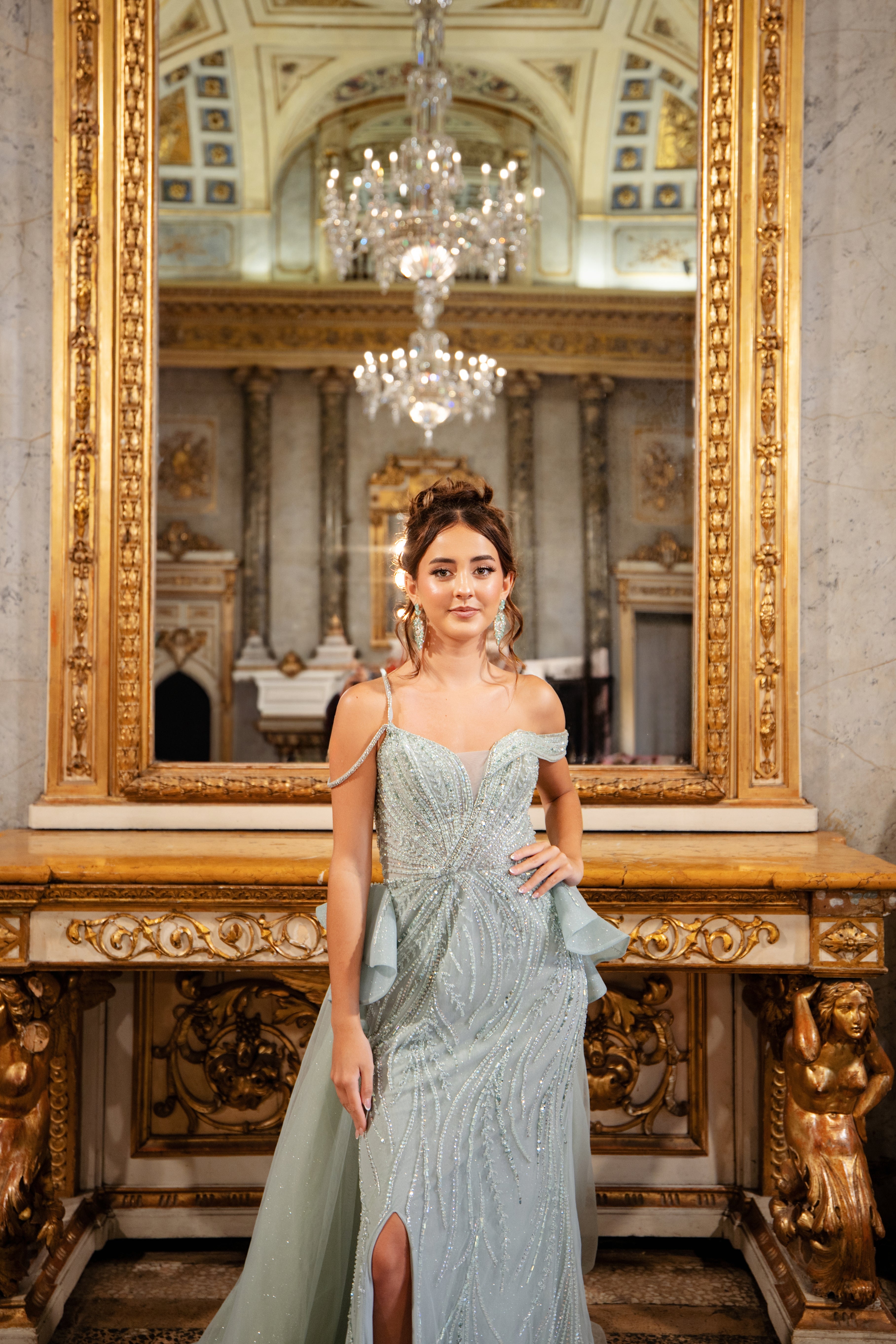 The Matilda Gown makes a bold statement with its asymmetrical neckline and delicate ruffle detail at the waist. Intricate beadwork and a flowing tulle overskirt frame the daring split, blending modern edge with ethereal elegance.