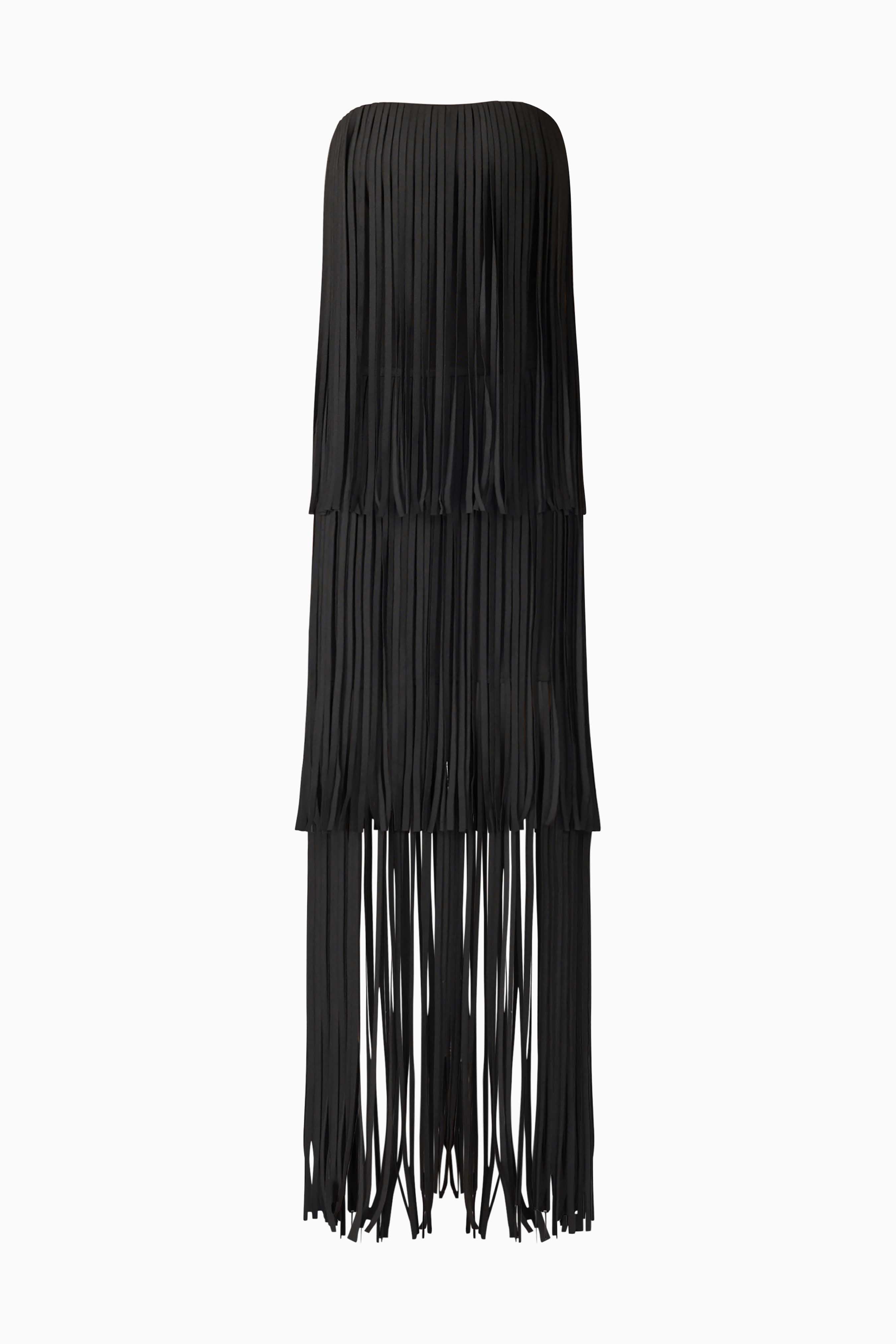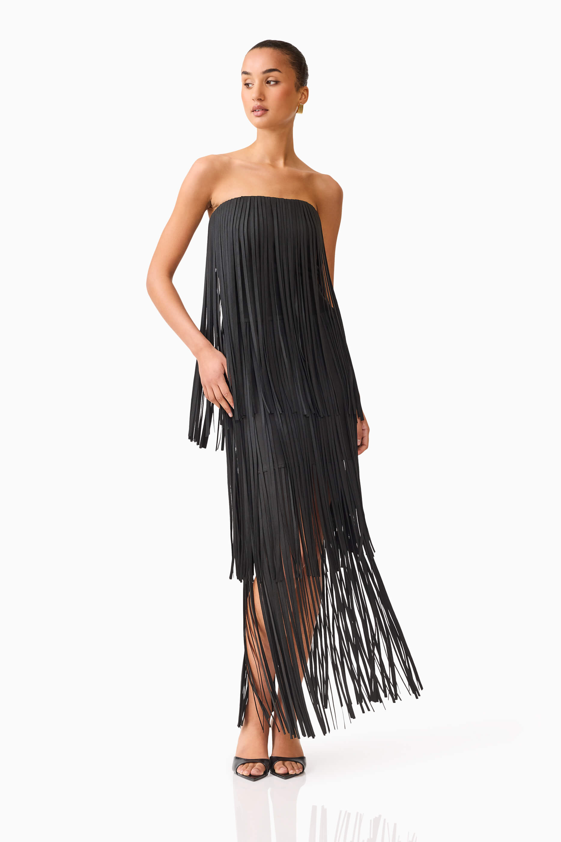 Refined yet impactful, the Alya Tiered Maxi Dress in Black blends sculptural design with fluid detailing for a modern take on evening-wear. Featuring a strapless neckline and fitted silhouette, this maxi dress creates a clean, elongated shape that feels both confident and timeless.