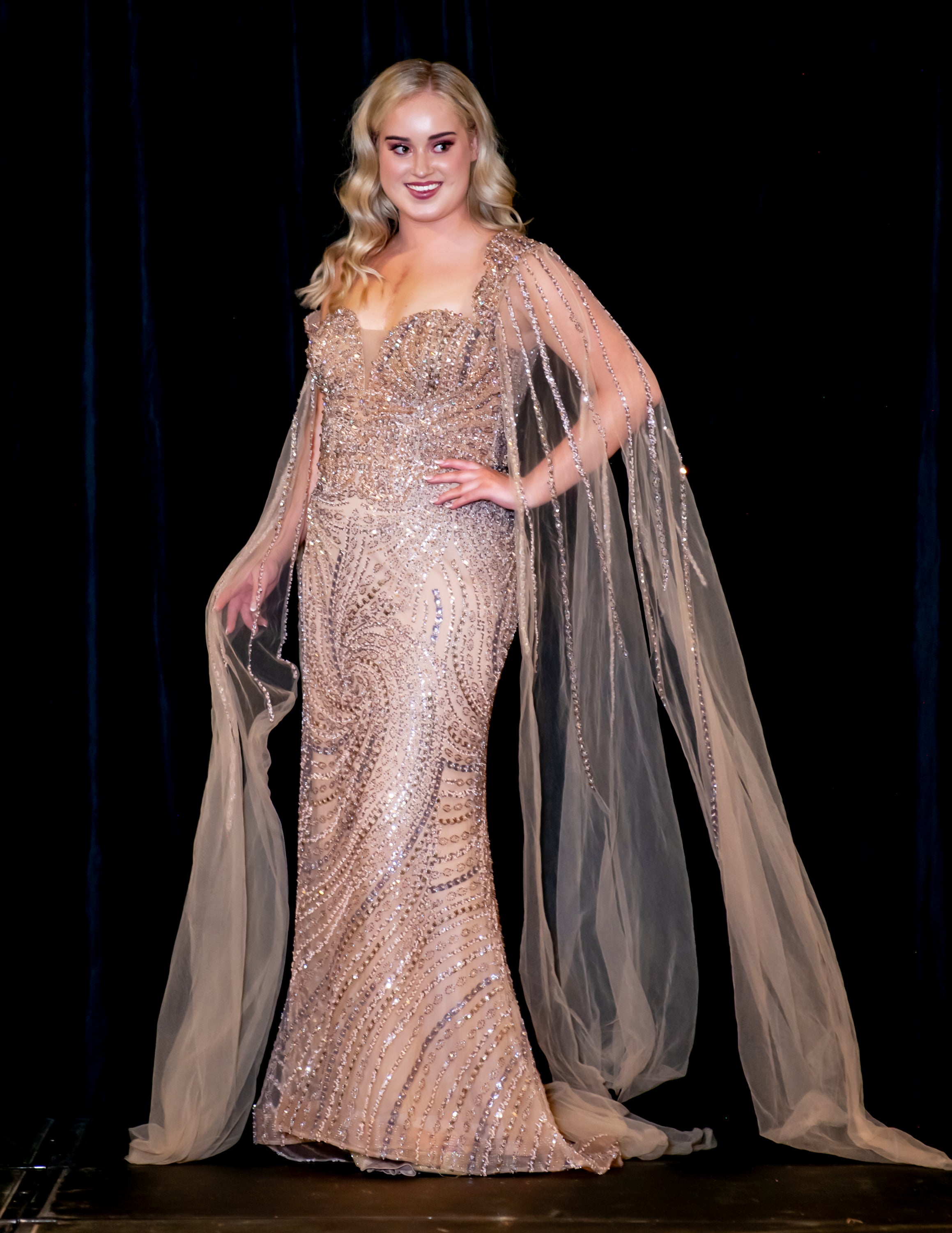 This stunning gown features a shimmering nude base adorned with intricate sequins in a swirling pattern. The sweetheart neckline is complemented by flowing sheer cape sleeves, creating a dramatic and elegant silhouette perfect for any red-carpet event or formal occasion.