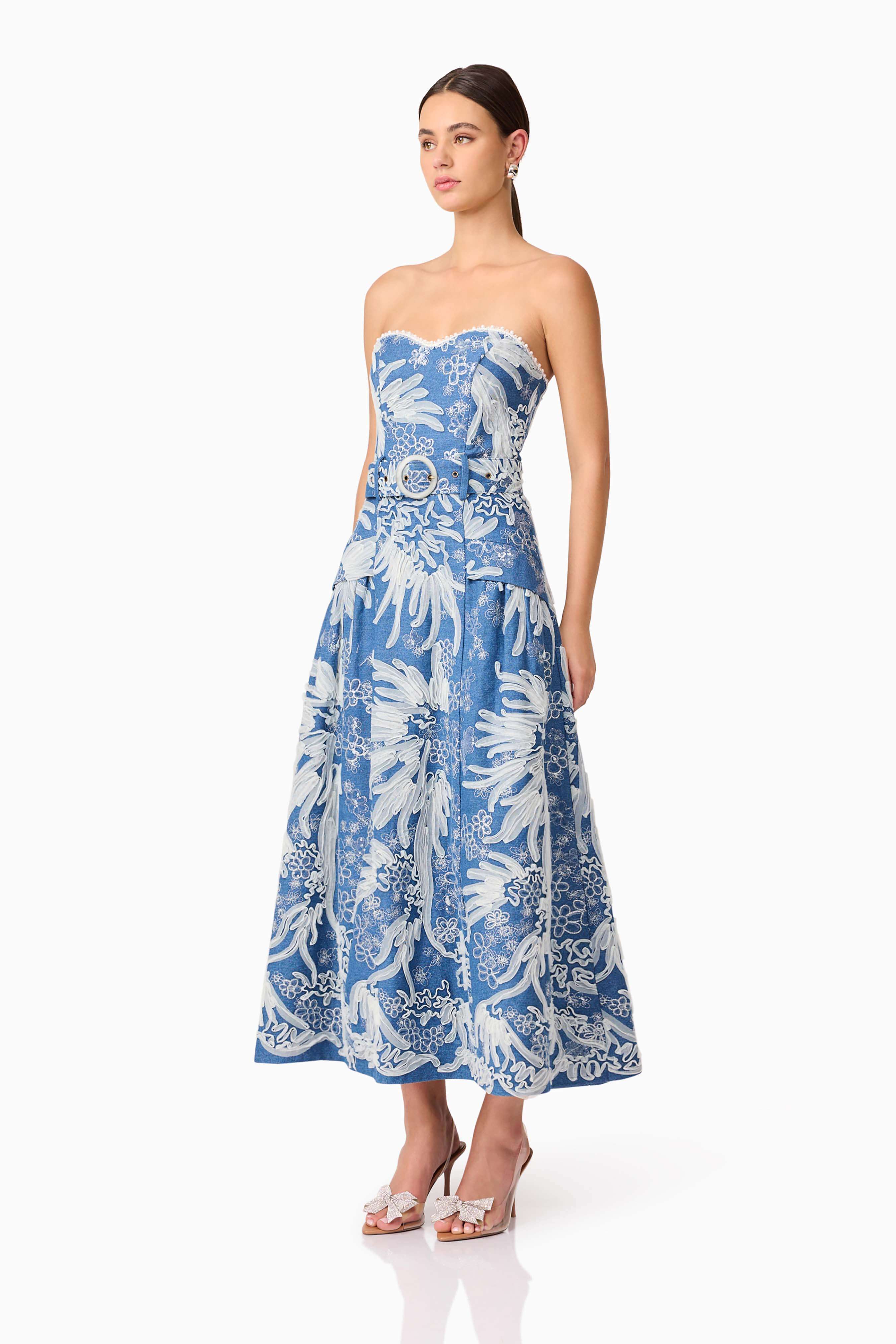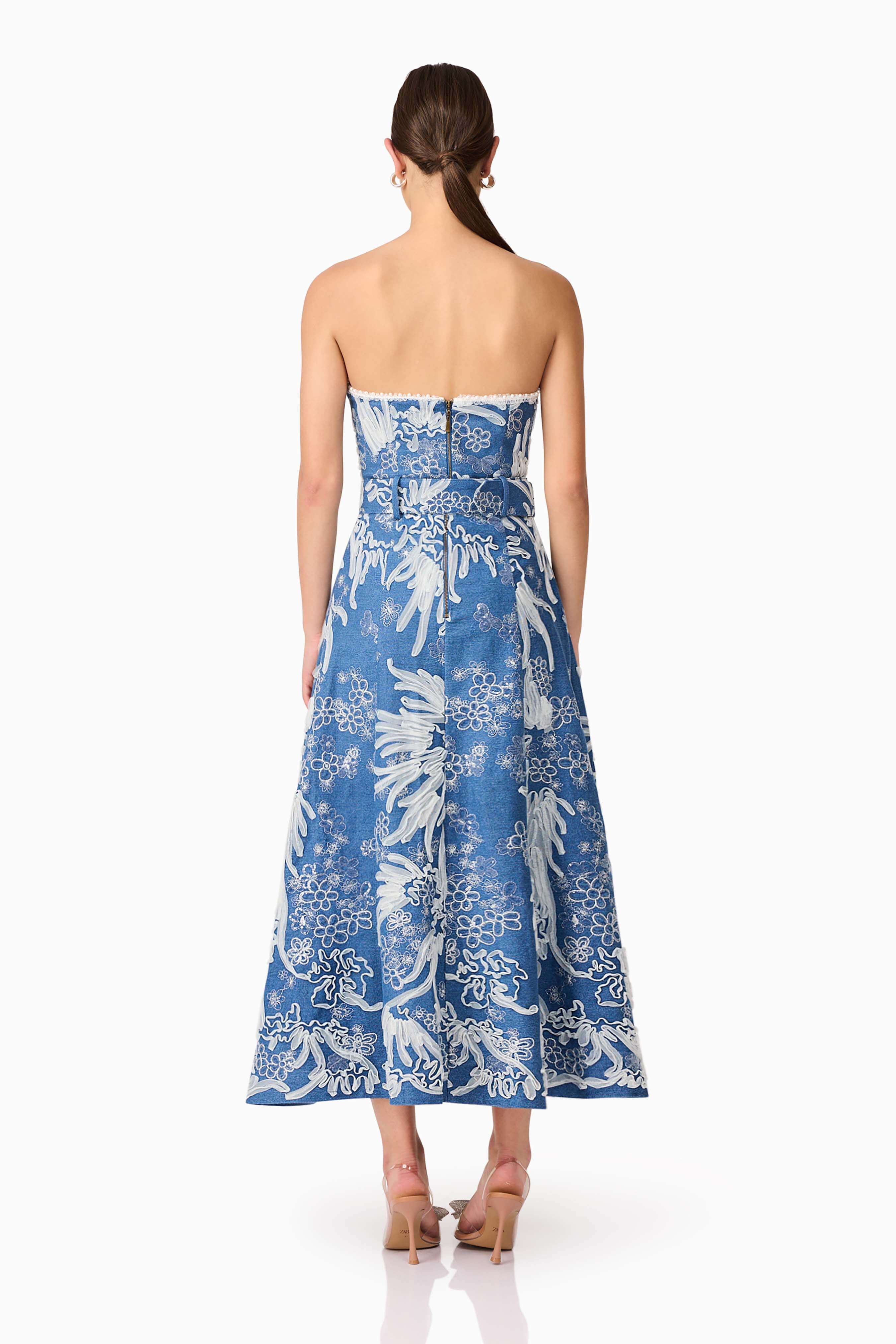 Elevate your wardrobe with the Anneliese Strapless Midi Dress in Blue, a versatile and romantic piece that redefines modern femininity. Crafted from a beautifully embroidered denim fabrication, this midi dress combines structure with softness for an effortlessly polished look.