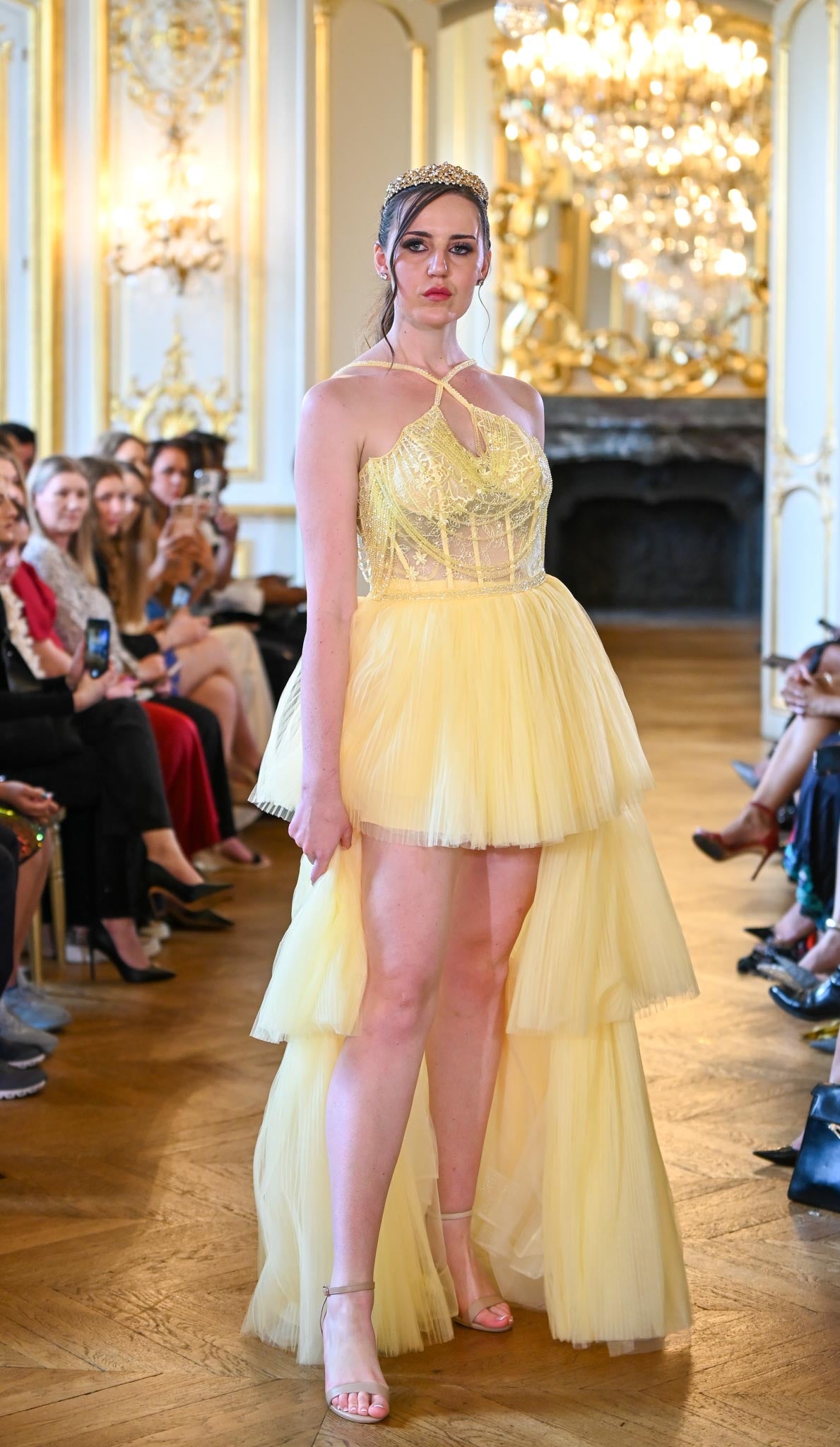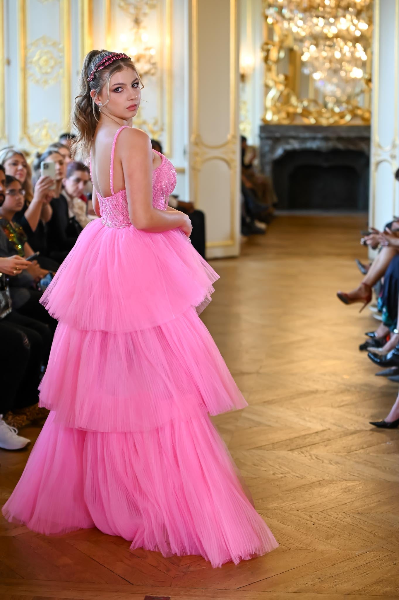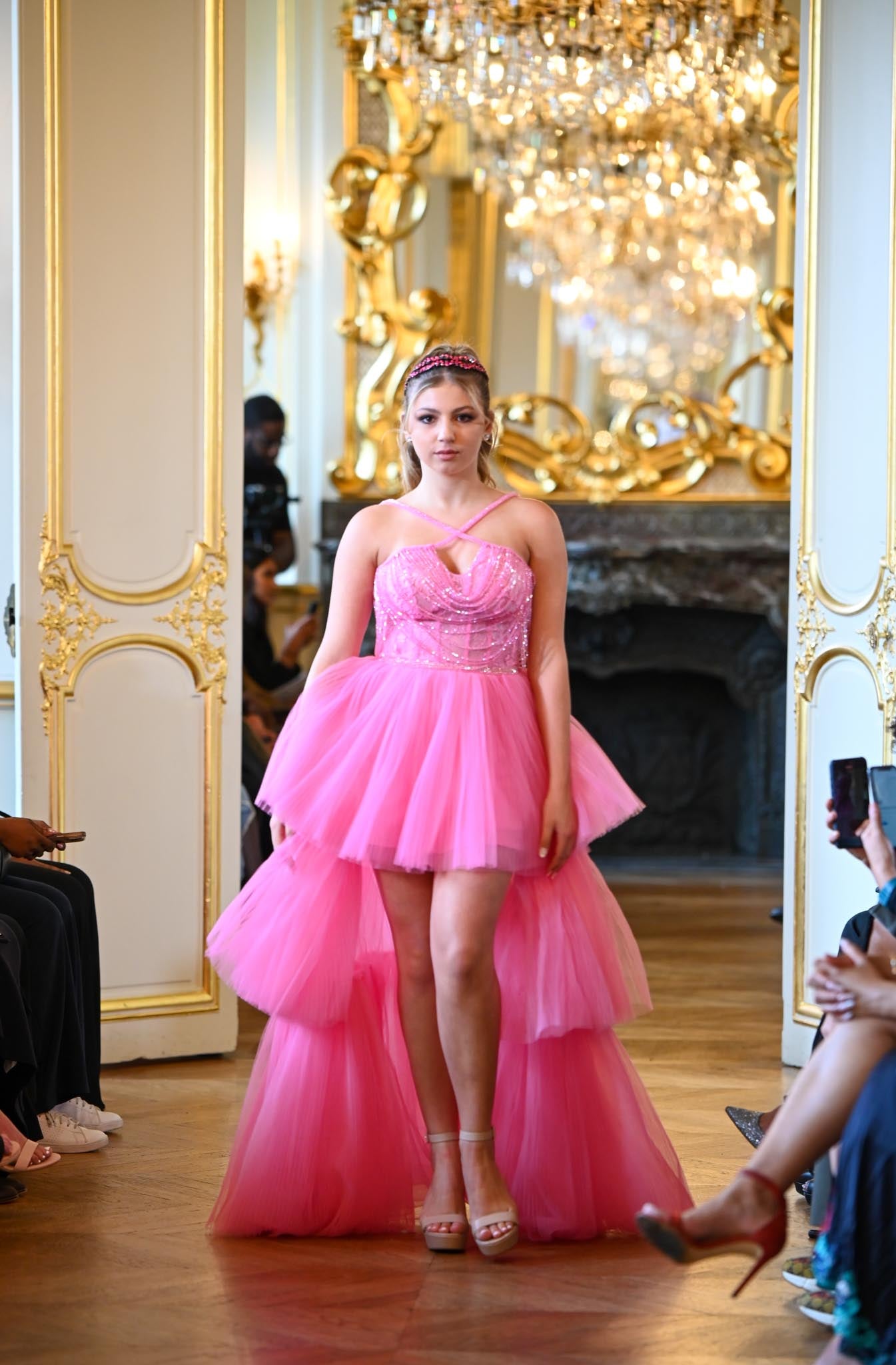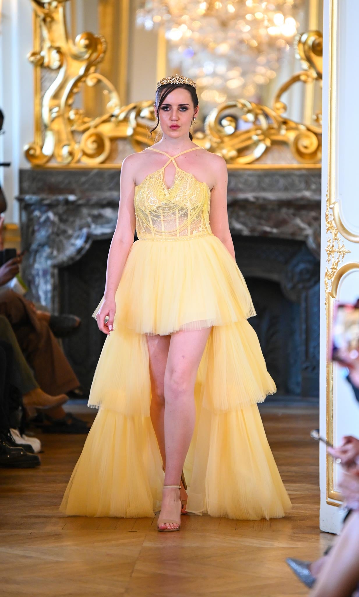 Dance through a fairytale in this high-low tiered ruffle gown—a whimsical masterpiece that blends elegance with playfulness. The beaded lace halter neck bodice sparkles like a constellation, framing your neckline with celestial allure. An attached beaded belt cinches the waist, adding a touch of enchantment to the silhouette. The pleated tiered high-low skirt creates a magical dance of fabric, short in the front and cascading longer around the sides and back. With each step, you're a vision in motion, leaving a trail of wonder. It's more than a gown; it's a swirl of dreams, where every bead and ruffle tells a story of whimsy.