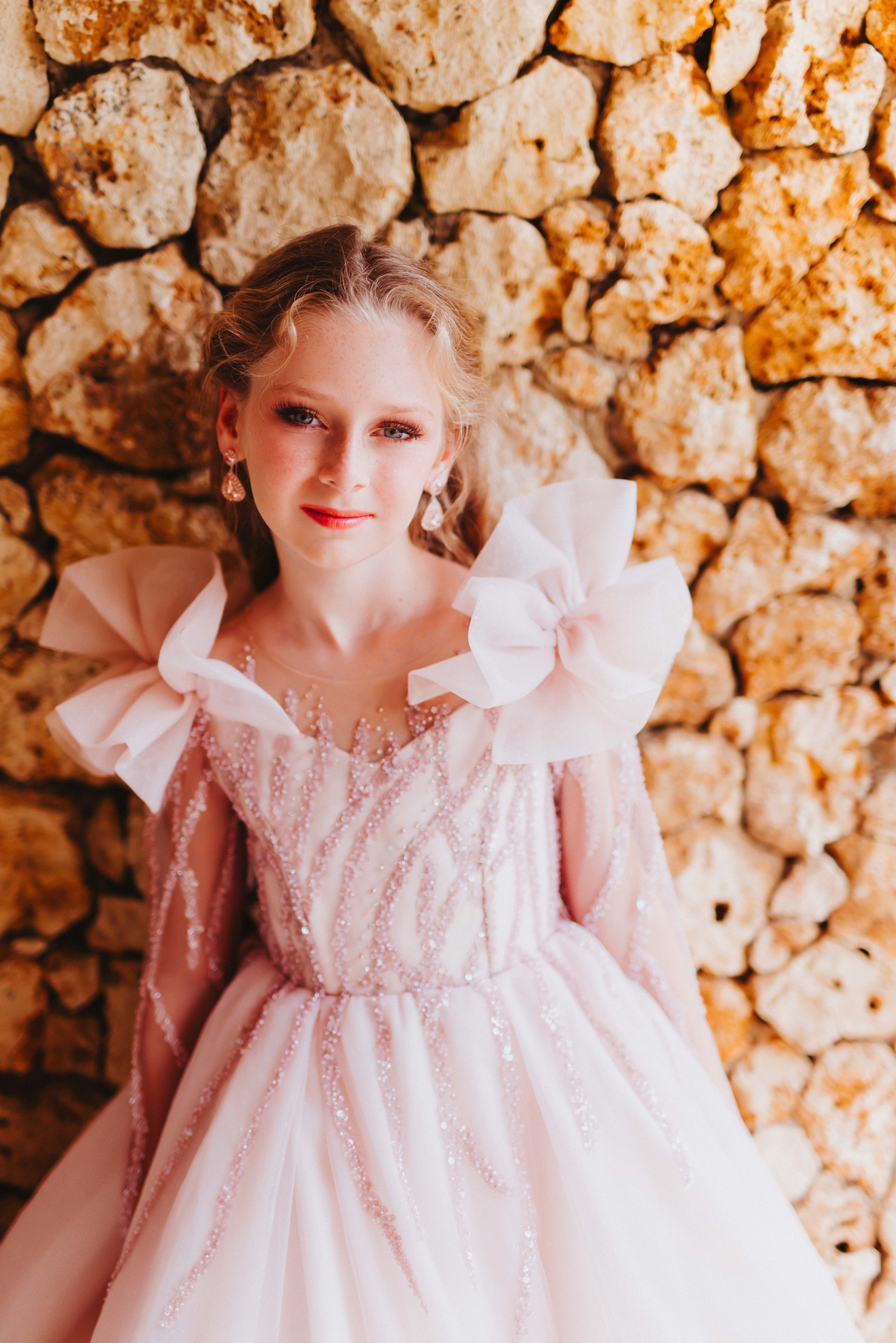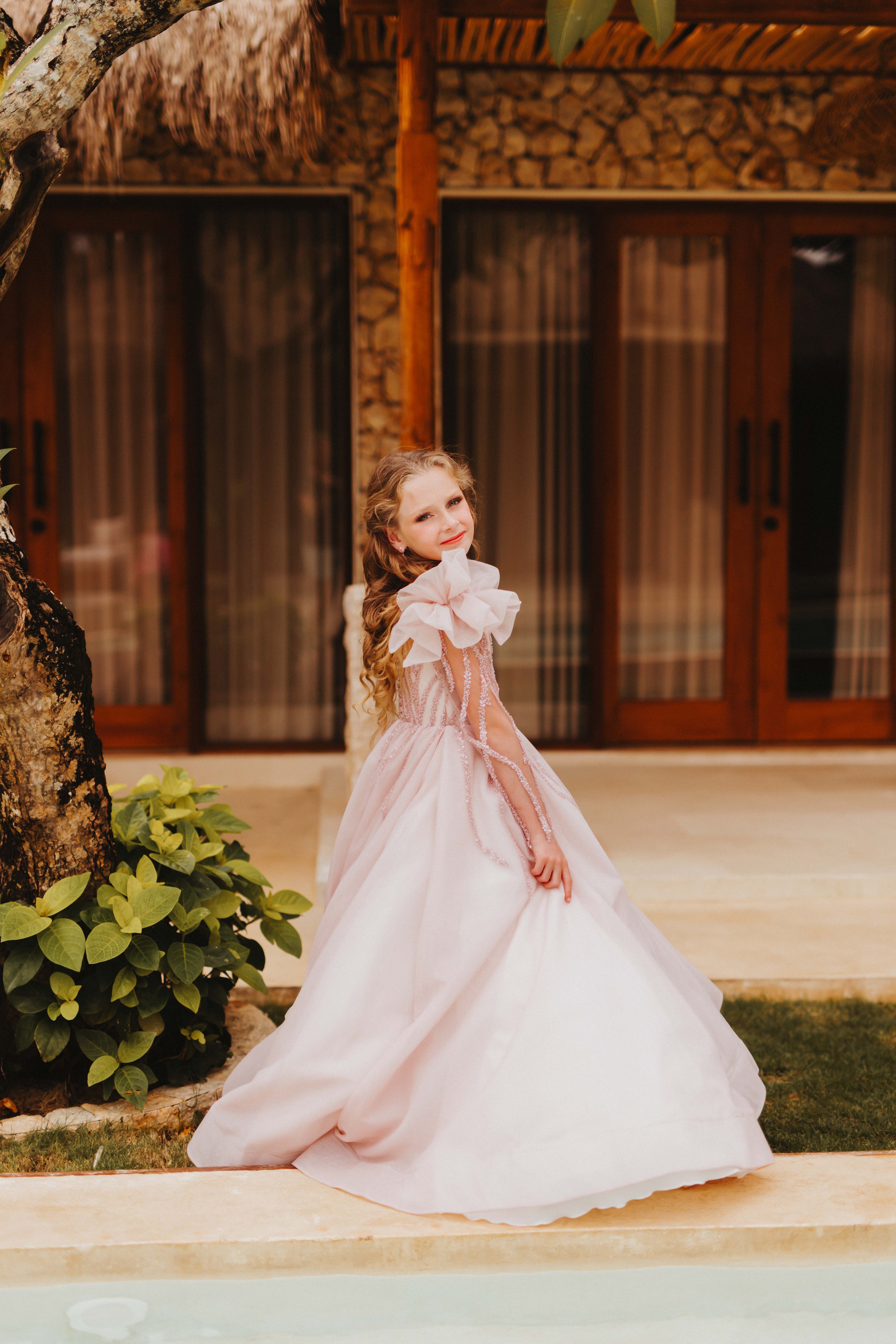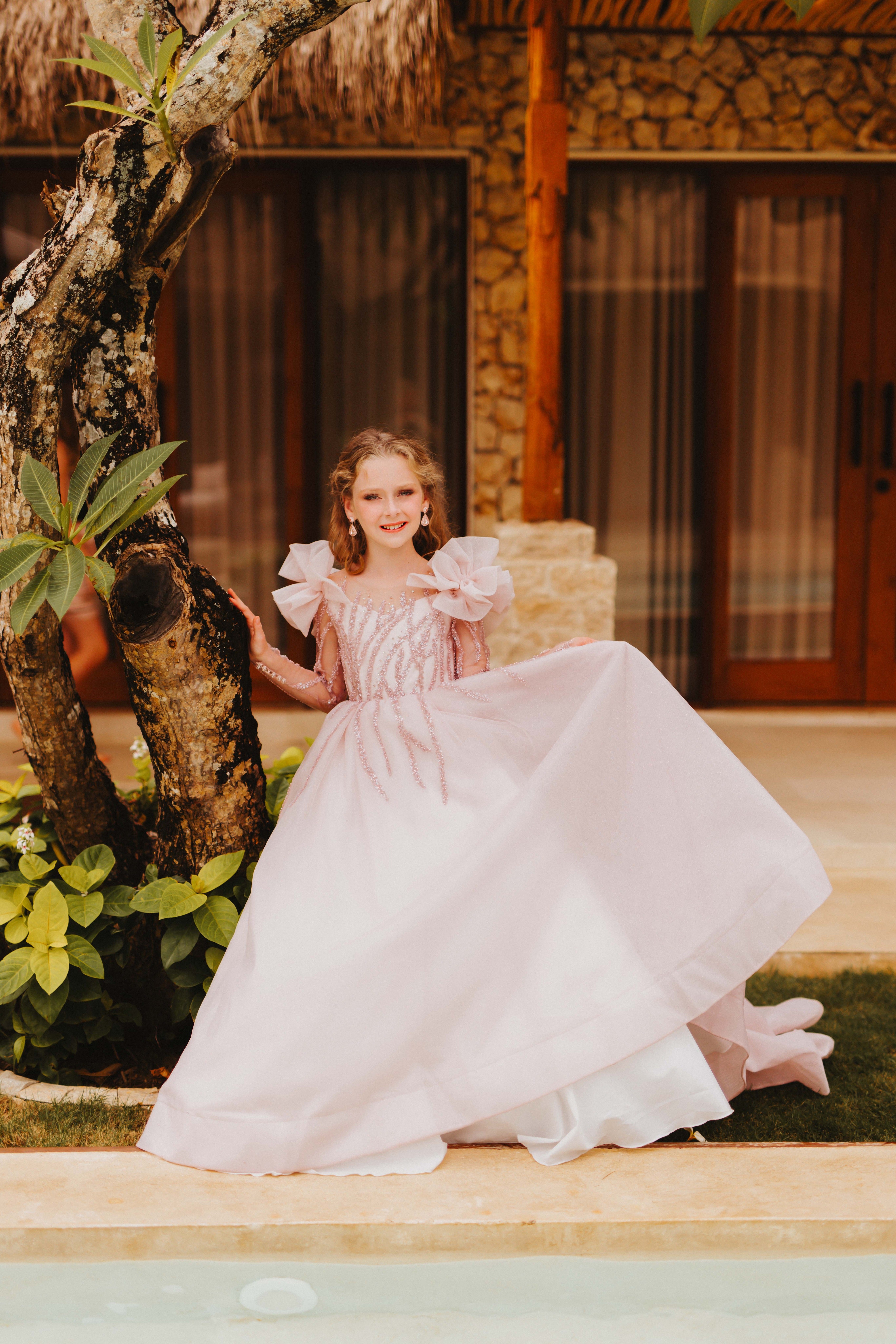 A vision of soft romance, the Imogen Gown features a blush pink beaded bodice with delicate long sleeves and floating tulle skirt. Statement tulle ruffles add a whimsical touch, making this gown perfect for fairytale moments.