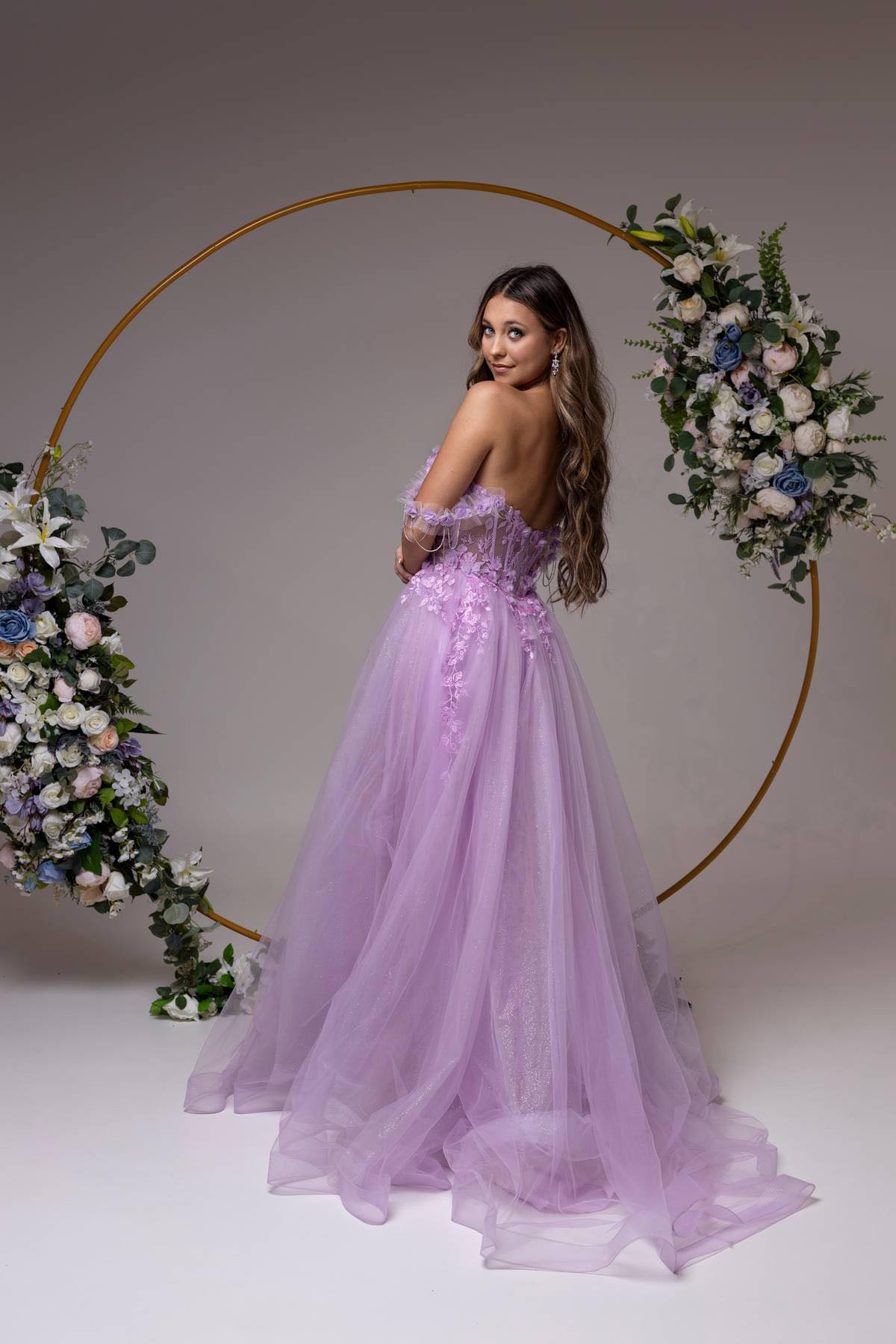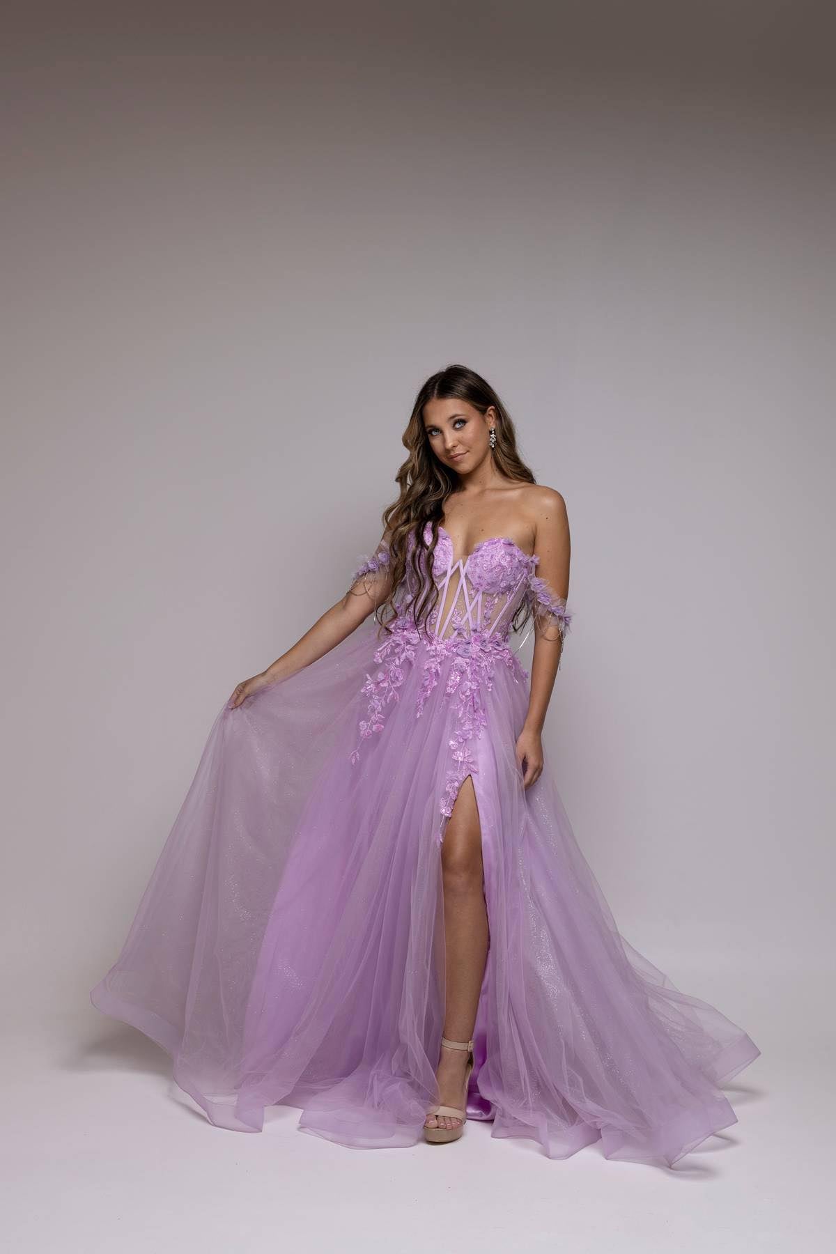 Indulge in ethereal enchantment with this strapless A-line dress, a romantic masterpiece that sweeps you into a world of whimsy. The sheer boned bodice, adorned with delicate lace appliqué, is a testament to timeless romance. Off-the-shoulder straps, embellished with a sparkling rhinestone drape, add a touch of celestial elegance. Layers of tulle cascade in a dance of dreams, creating an A-line silhouette that embodies grace and allure. With each step, you become the protagonist in your own love story, draped in the magic of rhinestones and lace. It's more than a dress; it's an ode to the poetry of love and style.