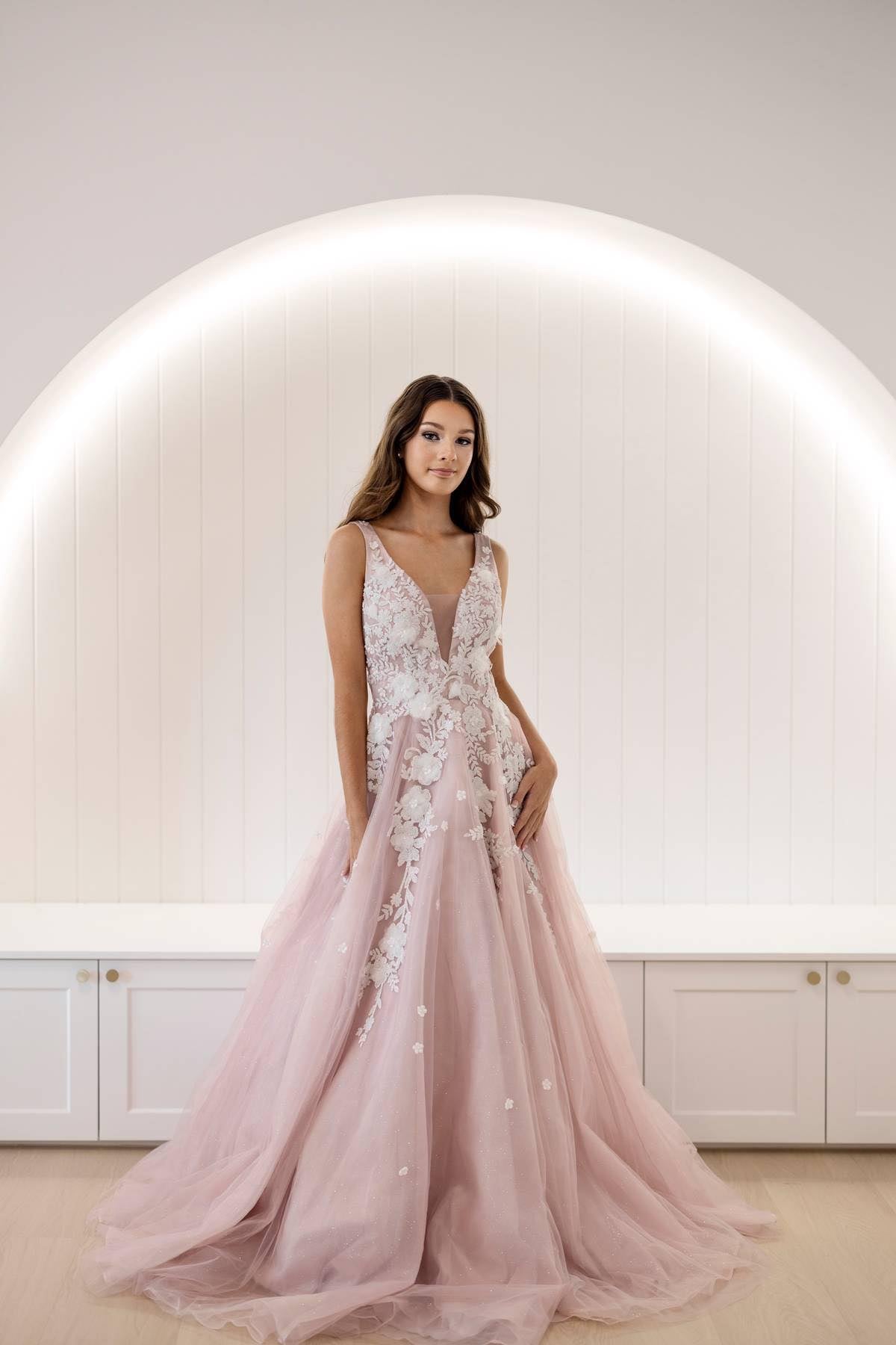 Gardenia gown is a layered tulle ball gown with floral diamond glitter motif trickling down the gown. 3D organza flowers add couture depth to the garment, while the pastel tone of the dress provides soft backdrop to the floral shimmer. The bodice features a illusion V-neckline with sheer side with deep V-back. The skirt is A-line shape with crinoline to support the silhouette.
