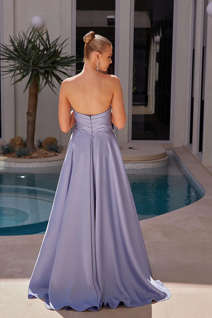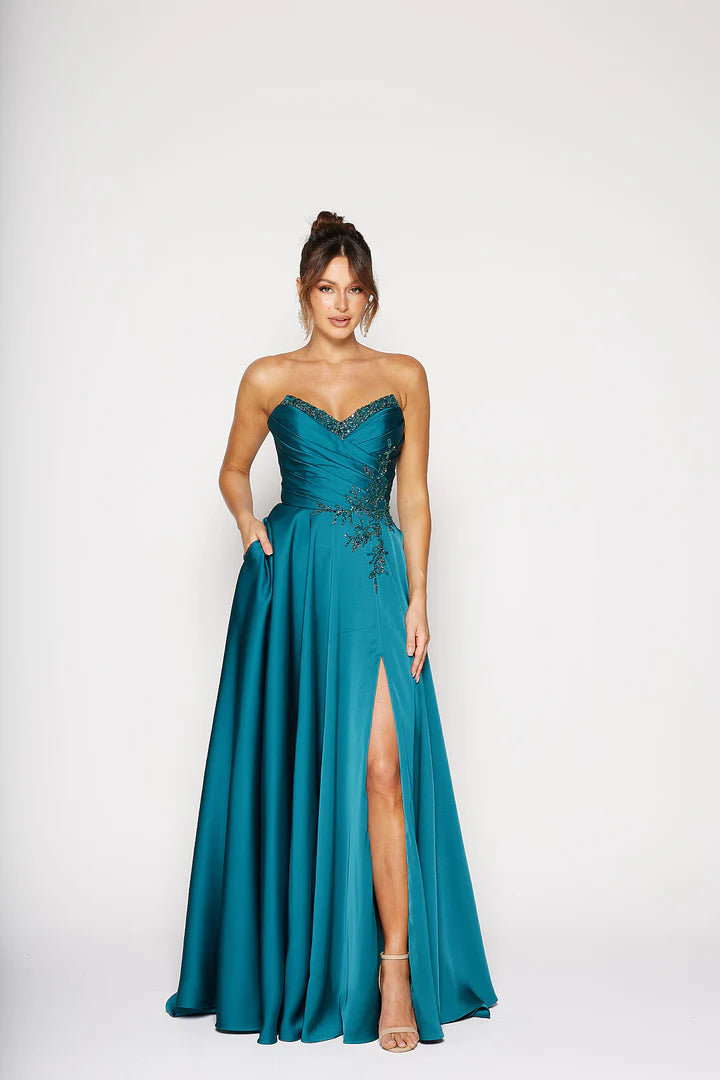 The modern sweetheart neckline is chic and alluring, enhanced by beaded detailing that gracefully adorns the neckline, runs under the bodice pleating, and through the side waist. It’s a look that exudes both opulence and grace.