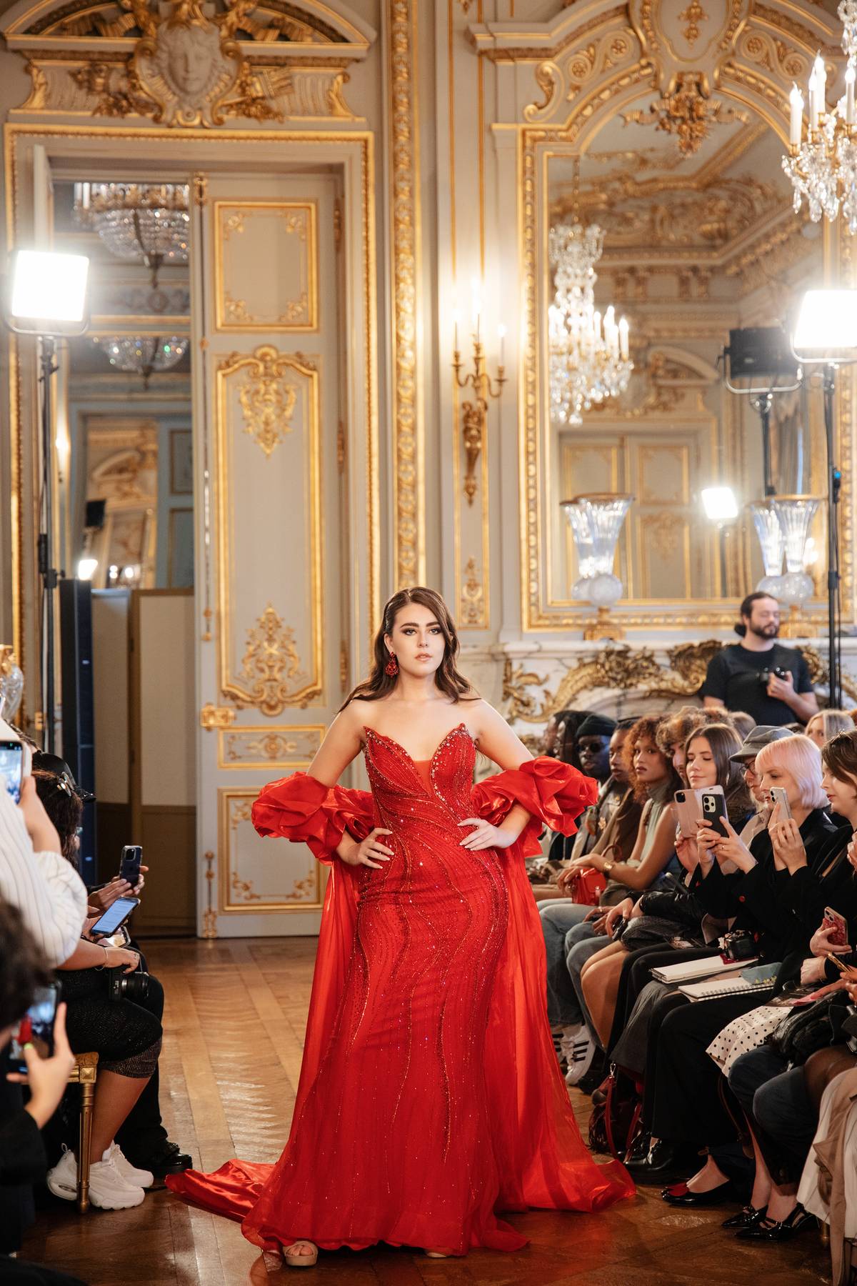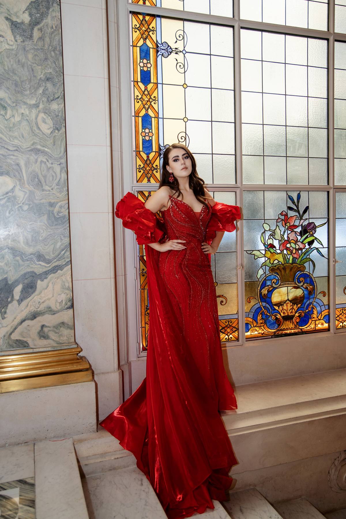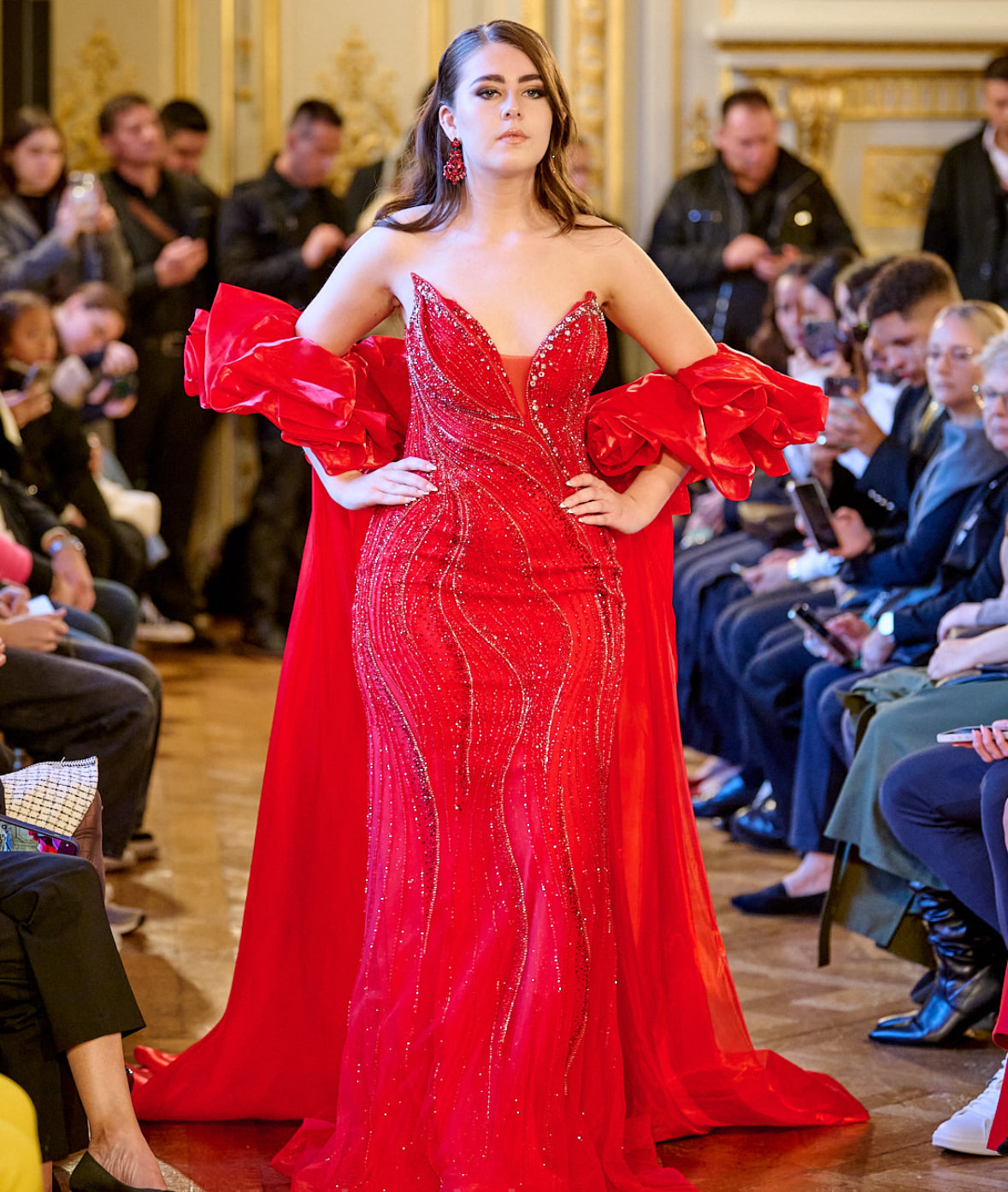 The Wendy Gown is a sleek couture slimline design, fully embellished with intricate beading for a sophisticated, high-fashion look. The strapless neckline creates a timeless silhouette, while the detachable cape with soft ruffled sleeves adds a statement of drama and elegance. A perfect balance of modern glamour and couture detail.
